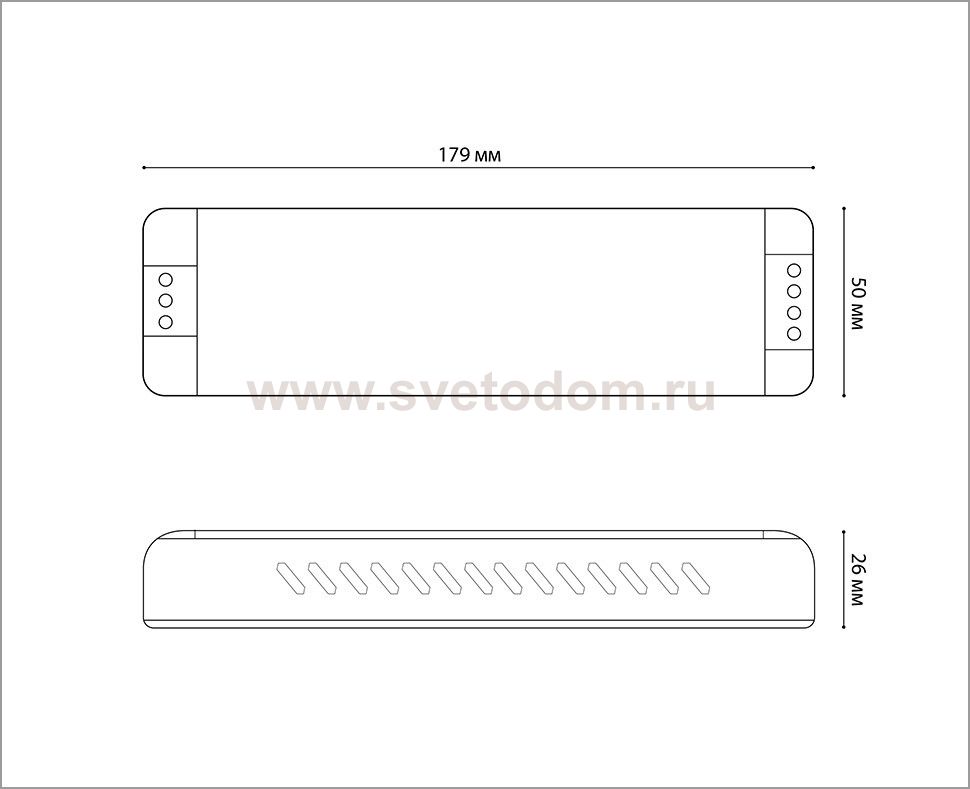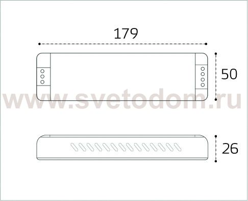 Габаритный размер блока питания - 179 х 50 мм h - 26 мм