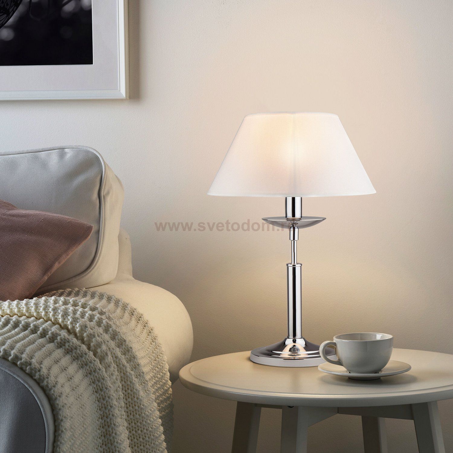 Благодаря белому тканевому абажуру настольная лампа создает мягкое рассеянное свечение, подходящее для комфортного чтения книг в вечернее время. Прочный металлический корпус светильника устойчив к механическим воздействиям, а защитное покрытие обеспечивает надежную электроизоляцию и презентабельный внешний вид.