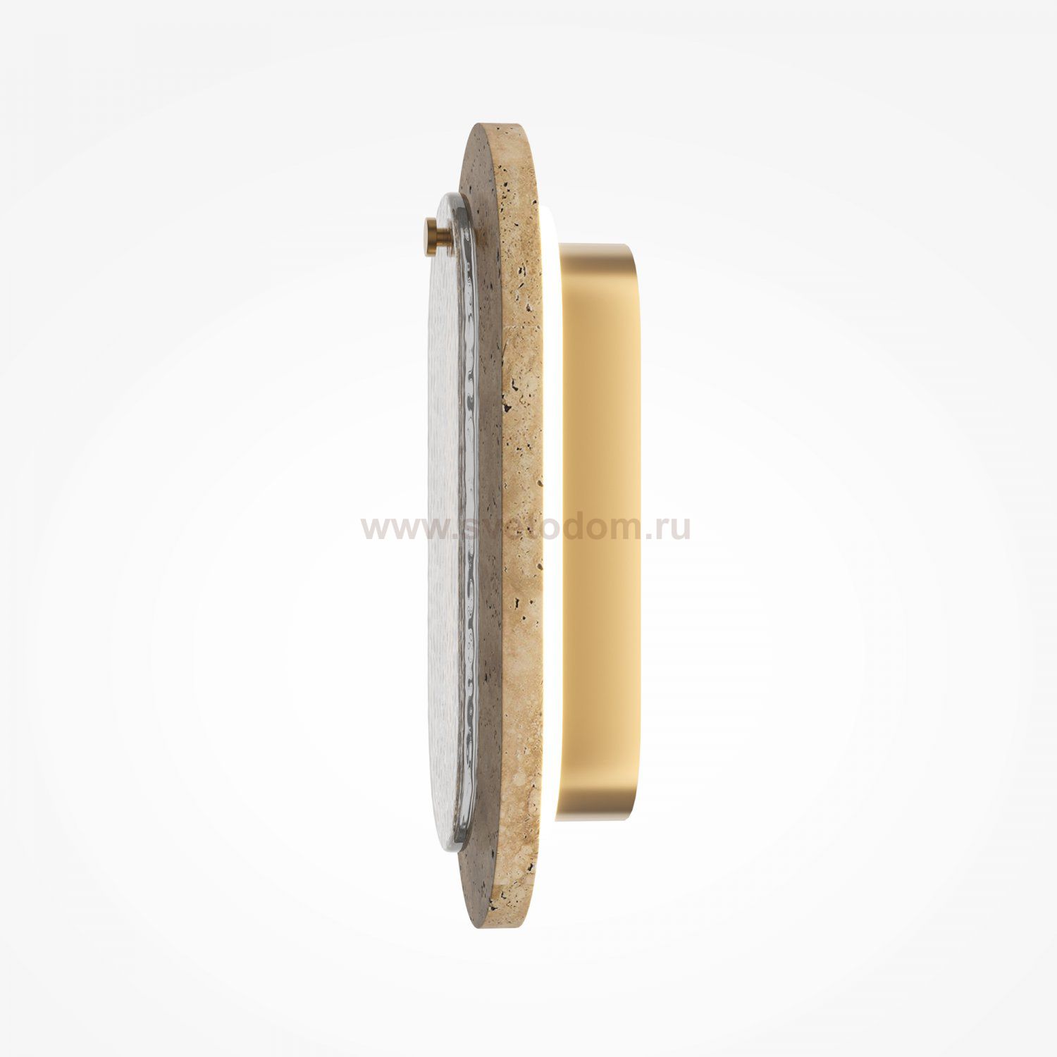 Характерный для серии контраст фактур: пористый травертин бежевого оттенка, металл цвета крашеной латуни и глянцевое стекло с «мятым» волнообразным паттерном. LED-источник (3000К) по контуру создаёт ореол на стене и подсвечивает стекло изнутри. Крафтовая обработка с неидеальными краями и лёгкой асимметрией придаёт каждому изделию эффект рукотворной эксклюзивности. Универсальны для современных жилых и коммерческих интерьеров. Эффектны как одиночный акцент и в композициях.