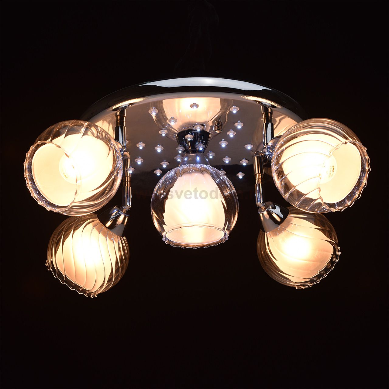 Описание модели 330011705: Люстра из коллекции «Альтаир» выполнена в стиле минимализм и идеально впишется практически в любой современный интерьер. Металлическое основание гальванизировано в цвет хрома. Интересная деталь – двойные плафоны - внутренняя часть из матово-белого стекла, а внешняя из прозрачного рифленого стекла. Благодаря такому дизайнерскому решению свет мягко рассеивается и создает уют и гармонию в комнате. Светильник оснащен спотовой системой, благодаря чему плафоны можно вращать на 180 градусов и самостоятельно менять направление светового потока. Помимо этого, люстра оснащена светодиодами и имеет три режима: теплый, дневной и синий свет. Функциональная, простая и стильная, она также идеально подходит для стандартных потолков. Имеет параметры освещенности порядка 15 кв.м.