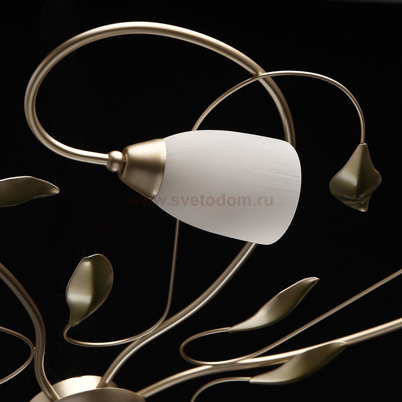 Металлическое основание перламутрового золота. Листья с зеленым оттенком. Стеклянные плафоны белого цвета. Преимущества модели
