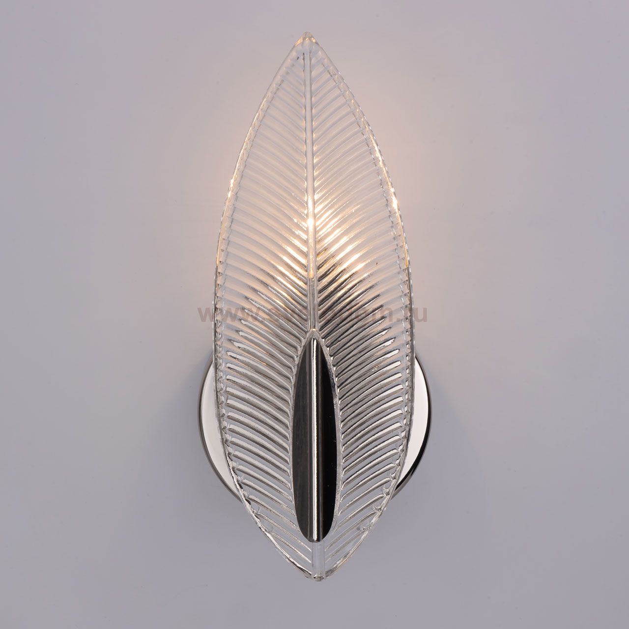 Металлическое основание настенного бра гальванизировано в цвет никеля. Вертикальное бра декорировано прозрачной стеклянной пластиной в форме листка. Комментарий