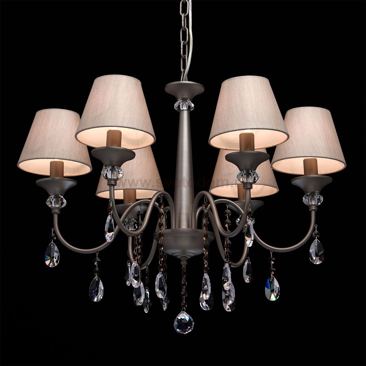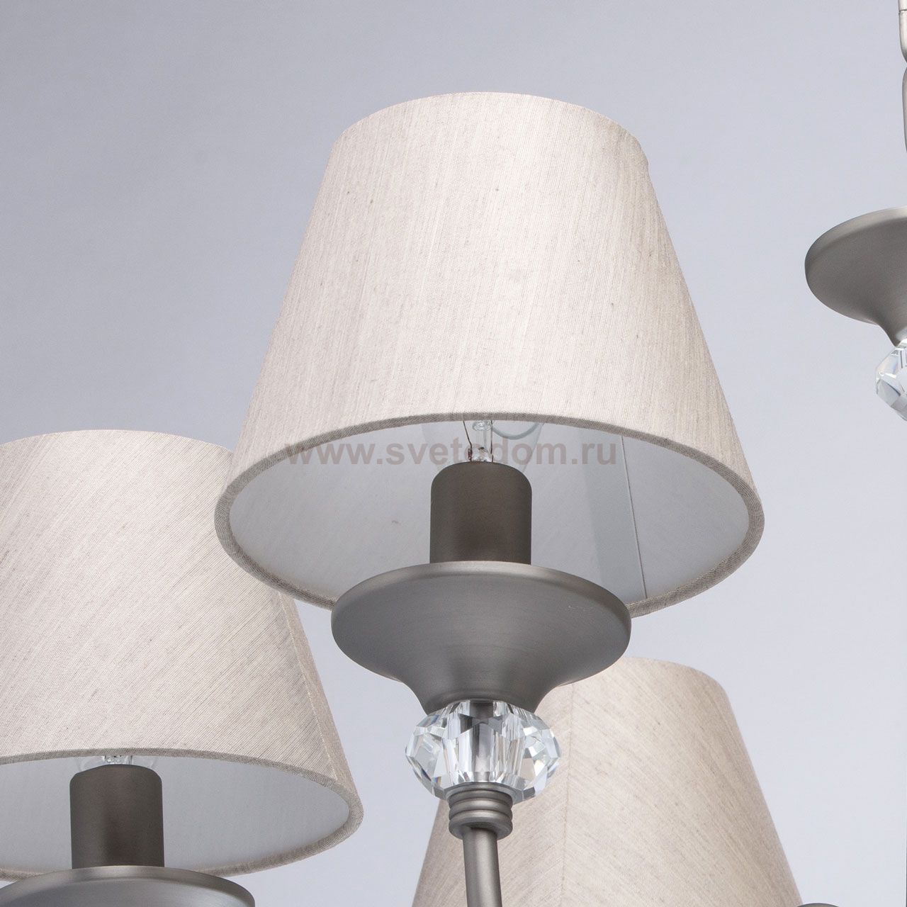 Матовое металлическое основание серебряного цвета, текстильные абажуры на акриловой основе, декоратаивные элементы из хрусталя. Материал плафона