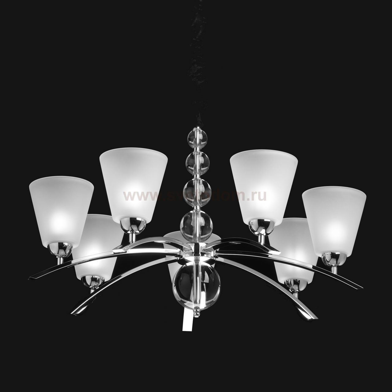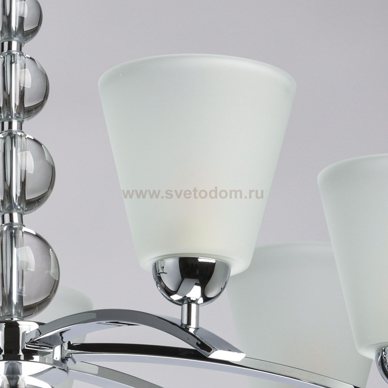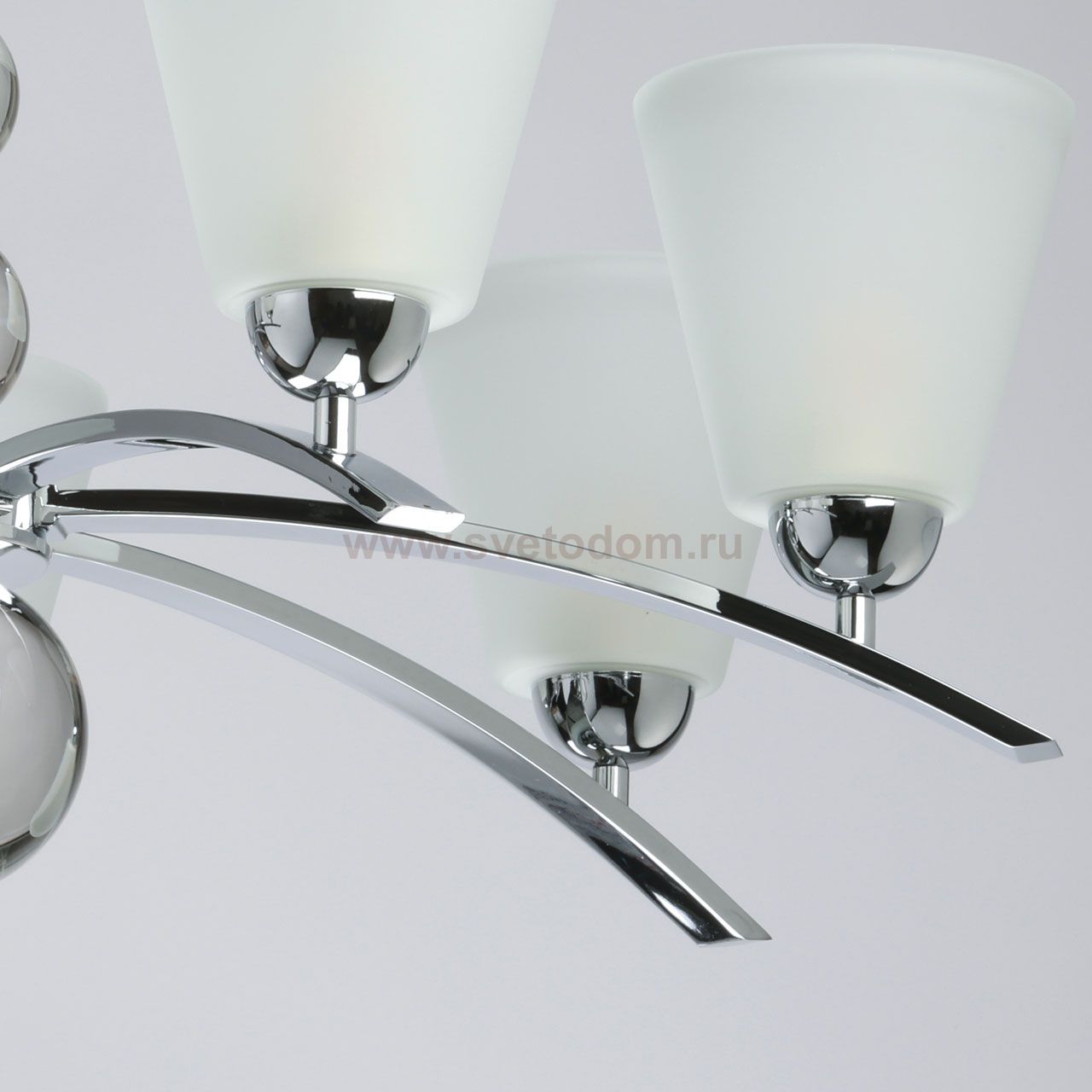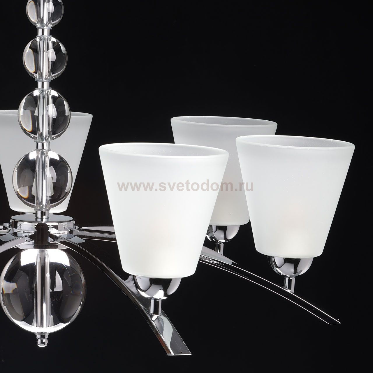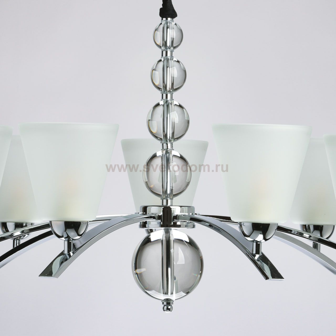 Металлическое основание подвесной люстры гальванизировано в цвет хрома. Центральная ось светильника декорирована прозрачными сферами из массива хрусталя. Источники света закрыты стеклянными плафонами, отлитыми в форму и окрашенными в белый цвет с внутренней стороны. Комментарий