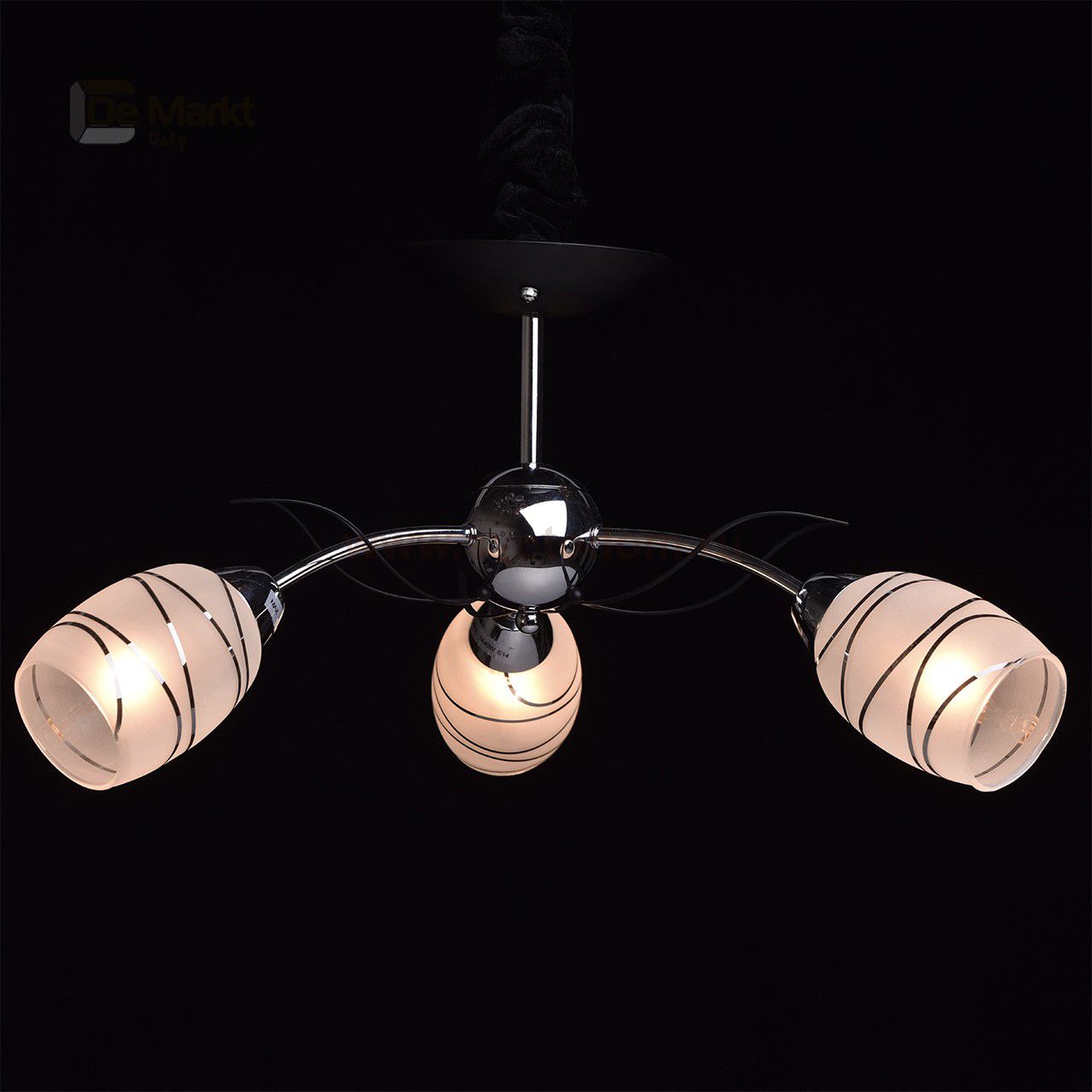 Описание модели 356019303: Люстра из коллекции «Нежность» выделяется оригинальным декором. Металлическое хромированное основание и абстрактные металлизированные полосы на плафонах в тон основания создают завершенную, продуманную композицию. Необычный декор в виде силуэта листьев из металла чёрного цвета придает игривость и дополнительную легкость. В сочетании со стандартными рожками и строгой формой плафонов они представляют необычный дуэт. Площадь освещения порядка 10 кв.м.