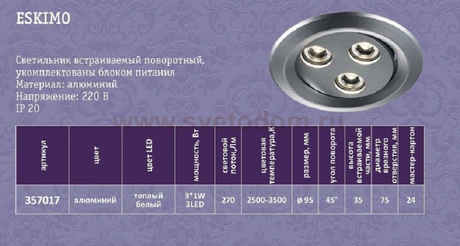 Снято с производства Отзывы Встраиваемый светильник Novotech 357017 ESKIMOПока нет отзывов об этом товаре, напишите и он обязательно появится после модерации! Оставить свой отзывПохожие товары Другие товары магазина Фото
