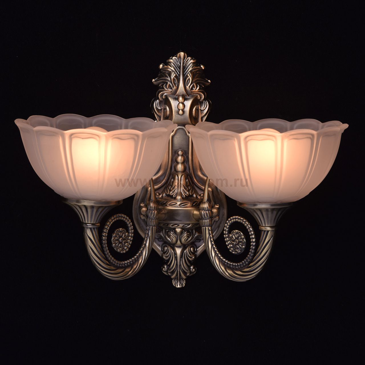 Арматура бра выполнена из сплава алюминия по технологии художественного литья и гальванизирована в цвет античной бронзы. Светильник декорирован плафонами, выполненными из стекла окрашенного в массе в белый цвет с добавлением желтых пигментов и обработанными по технологии пескоструйного матирования. Плафоны отлиты в сложную форму. Комментарий