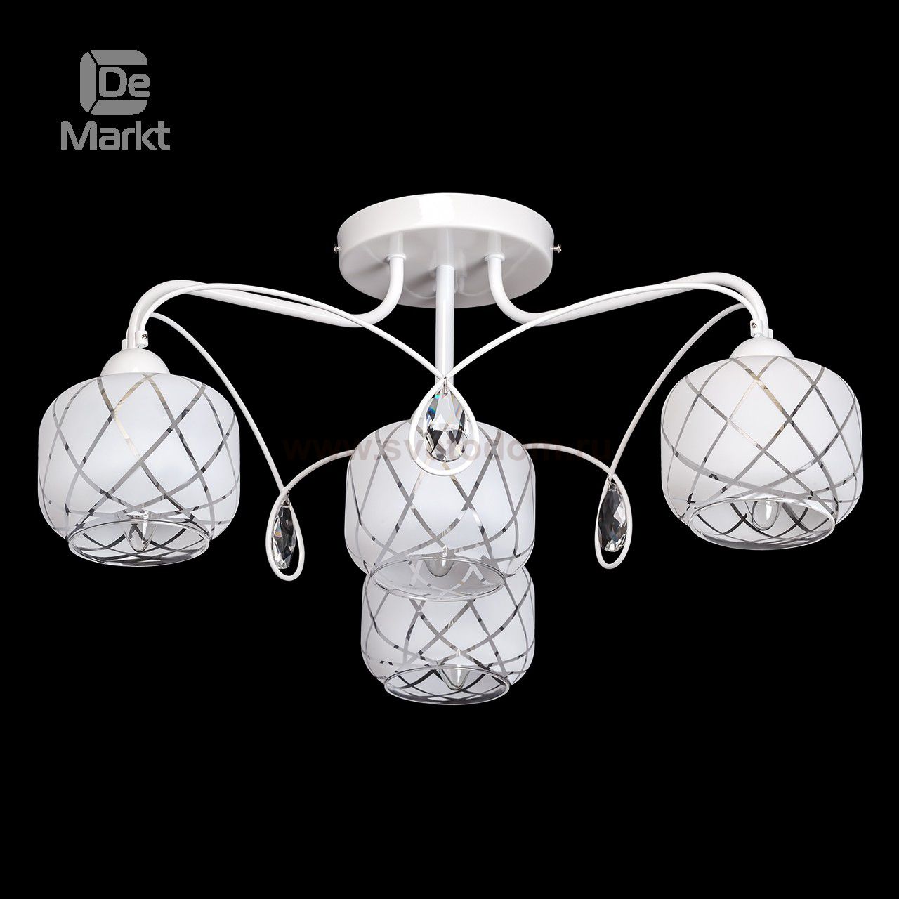 Металлическое основание белого цвета, стеклянные плафоны, декоративные подвески из хрусталя. Материал декора