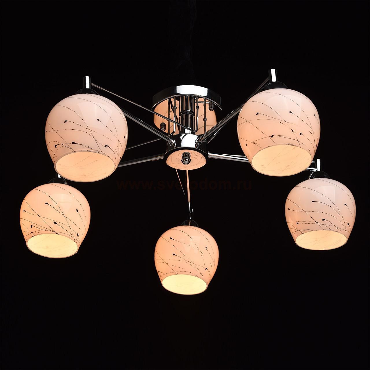 Металлическое основание цвета хрома, плафоны из стекла белого глянцевого цвета, декорированные абстрактным рисунком Место применения