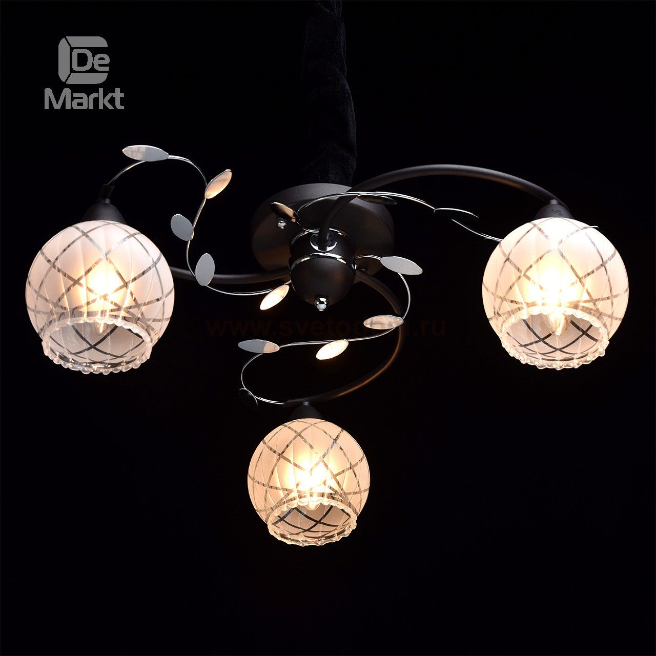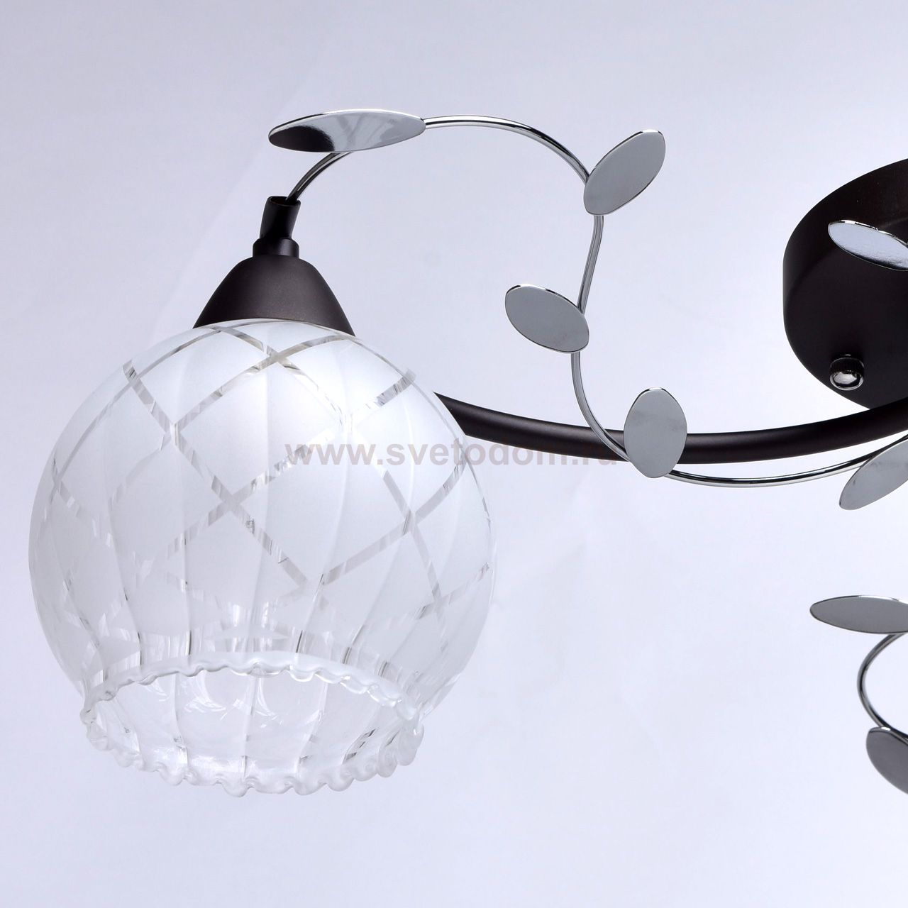 Описание модели 358018703: Люстра из коллекции «Грация» привлекает цветовой гаммой и гармоничным декором. Матовое металлическое основание выдержано в цвете крепкого кофе, а декоративные элементы растительного стиля – в цвете хрома. Стеклянные плафоны округлой формы декорированы прозрачным геометрическим рисунком в форме ромбов и рельефной кромкой. Люстра идеально подходит для стандартных потолков. Рекомендуемая площадь освещения порядка 15 кв.м.