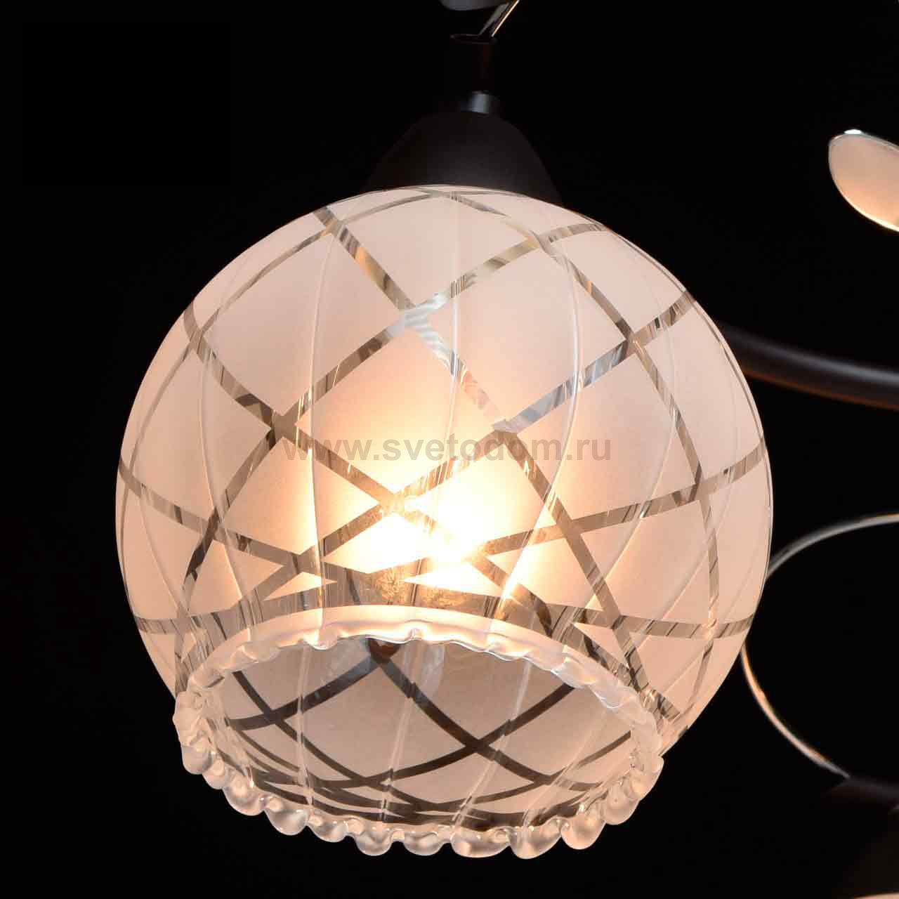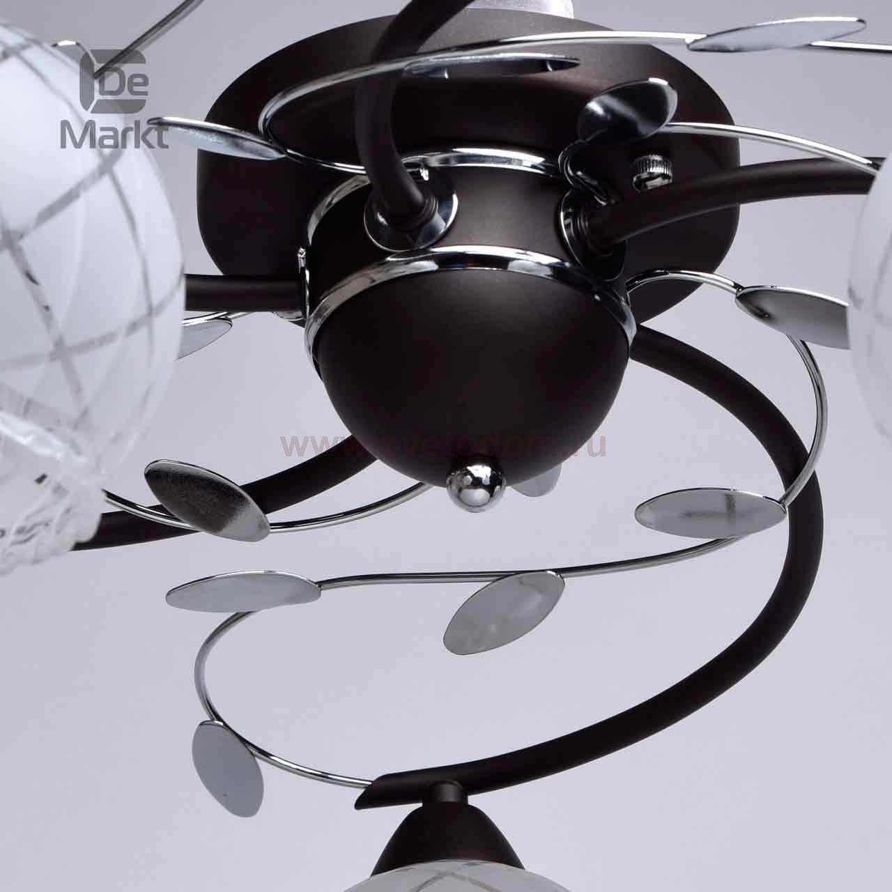 Описание модели 358018905: Люстра из коллекции «Грация» привлекает цветовой гаммой и гармоничным декором. Матовое металлическое основание выдержано в цвете крепкого кофе, а декоративные элементы растительного стиля – в цвете хрома. Стеклянные плафоны округлой формы декорированы прозрачным геометрическим рисунком в форме ромбов и рельефной кромкой. Люстра идеально подходит для стандартных потолков. Рекомендуемая площадь освещения порядка 15 кв.м.