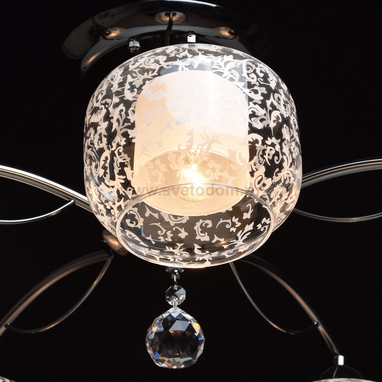 Описание модели 358019405: Легкая, изысканная, без лишних деталей люстра из коллекции «Грация» оправдывает своё название – она действительно по-настоящему грациозна. Металлическое основание цвета никеля, рожки плавно изогнуты и переходят в оригинальные двойные плафоны. Внешний плафон выполнен из прозрачного стекла округлой прямоугольной формы и декорирован растительным трафаретным рисунком белого цвета, который придает композиции особую живописность. Внутренний матовый плафон декорирует патрон светильника и создает мягкое распределение светового потока. Яркий акцент – декоративный подвес из хрусталя в центральной части светильника. Рекомендуемая площадь освещения порядка 15 кв.м.