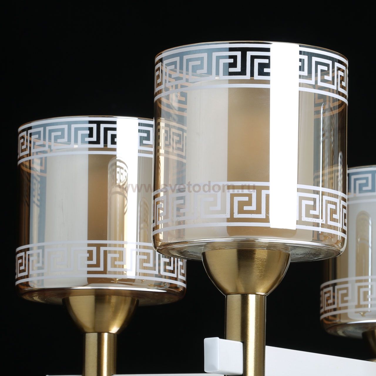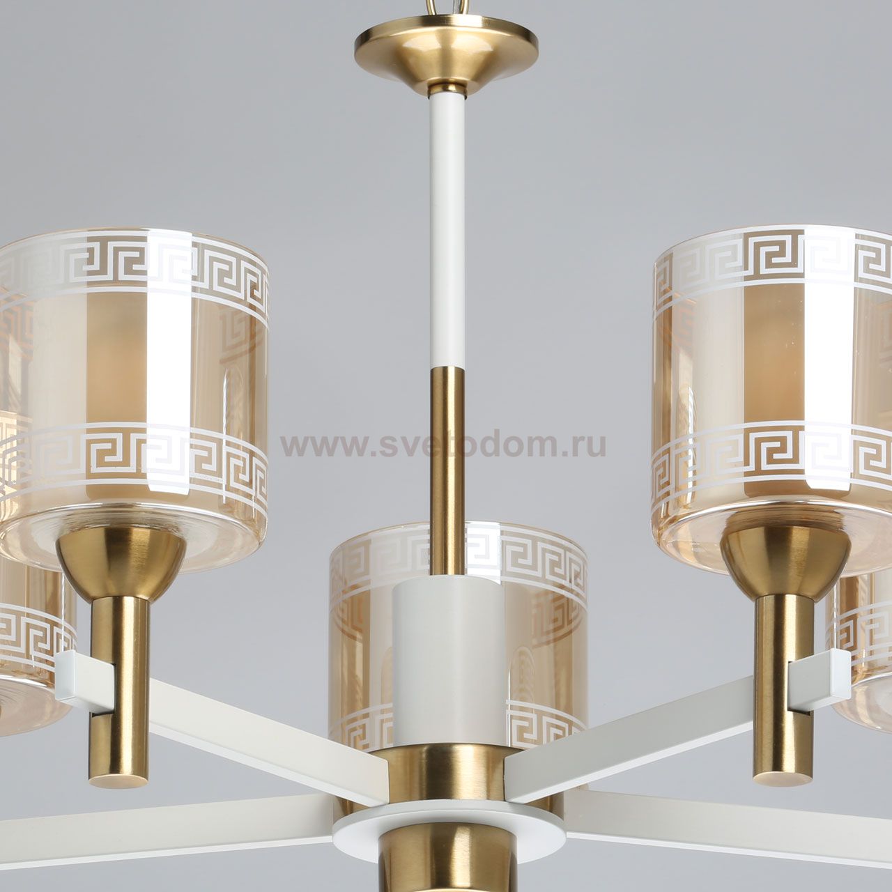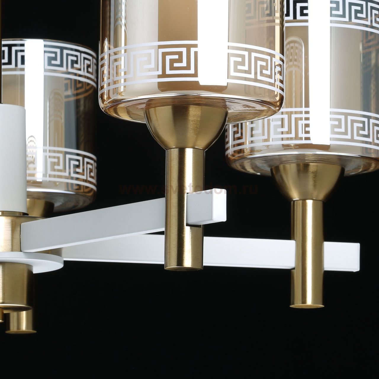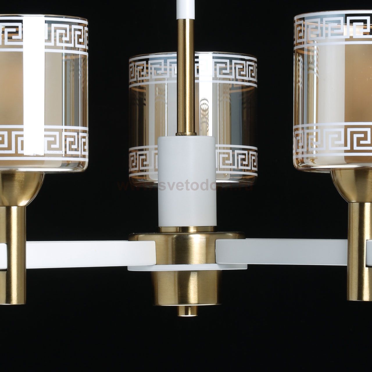 Металлическое основание подвесной люстры окрашено в белый цвет. Отдельные элементы основания гальванизированы в цвет золота. Источники света закрыты двойными стеклянными плафонами, где внутренний плафон матирован, а внешний плафон гальванизирован в цвет шампань. На внешние плафоны белой краской по трафарету нанесен орнамент в греческом стиле. Комментарий