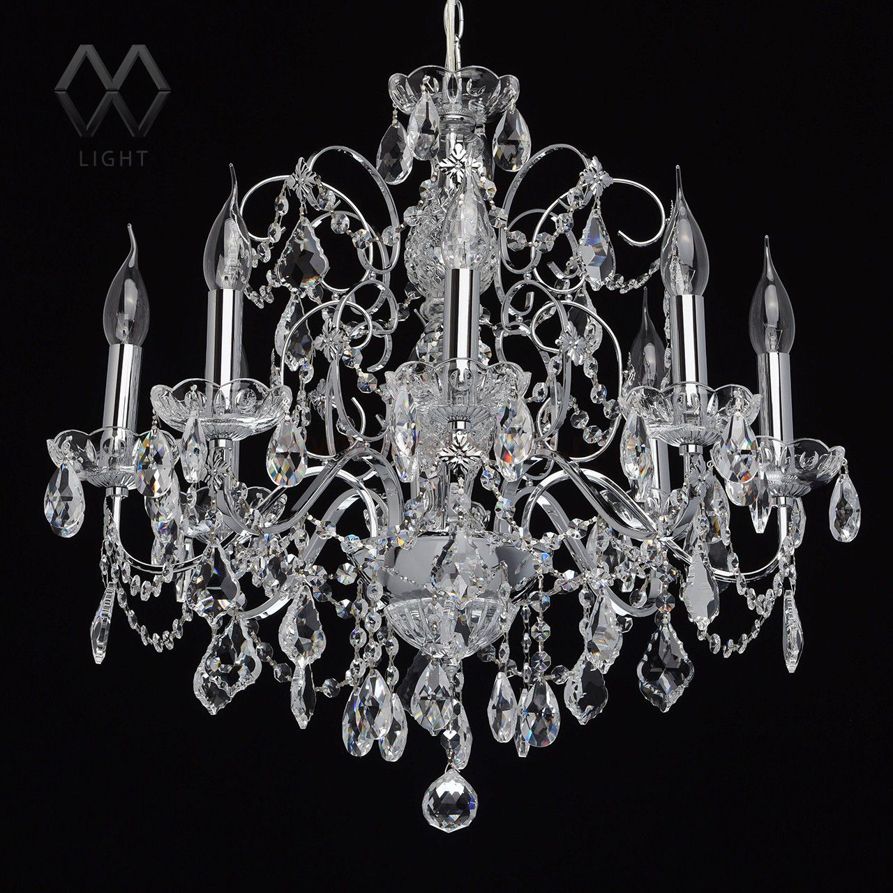 Арматура светильника выполнена из сплава железа и гальванизирована в цвет хрома. Центральная ось декорирована прозрачным стеклом со сложным орнаментом. Розетки выполнены из прозрачного стекла, отлитого по форме. Светильник декорирован хрустальными подвесками 4-х видов: октагон, миндаль, дубовый лист, шар. Комментарий