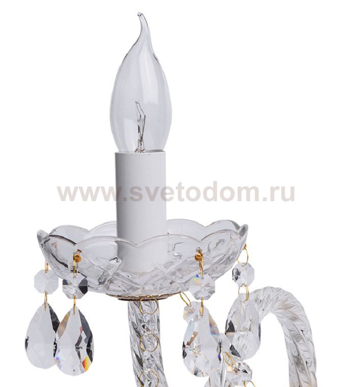 Арматура выполнена из сплава металла и гальванизирована в цвет французского золота. Рожки светильника выполнены из стекла гутным способом. Сверху арматура декорирована прозрачным хрустальным стеклом с градуированной огранкой. Светильник декорирован бусами из хрусталя и хрустальными подвесками 4-х видов огранки. Комментарий