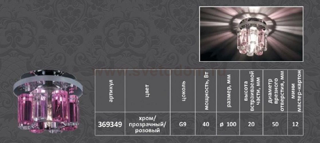 Встраиваемые светильники – популярное осветительное оборудование, которое можно использовать в качестве основного источника или в дополнение к люстре. Они позволяют создать нужную атмосферу атмосферу и привнести в интерьер уют и комфорт. Интернет-магазин «Светодом» предлагает стильный встраиваемый светильник Novotech 369349. Данная модель достаточно универсальна, поэтому подойдет практически под любой интерьер. Перед покупкой не забудьте ознакомиться с техническими параметрами, чтобы узнать тип цоколя, площадь освещения и другие важные характеристики. Приобрести встраиваемый светильник Novotech 369349 в нашем онлайн-магазине Вы можете либо с помощью «Корзины», либо по контактным номерам. Мы развозим заказы по Москве, Екатеринбургу и остальным российским городам.