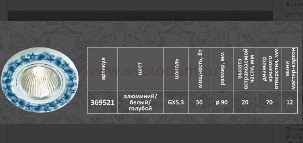 Встраиваемые светильники – популярное осветительное оборудование, которое можно использовать в качестве основного источника или в дополнение к люстре. Они позволяют создать нужную атмосферу атмосферу и привнести в интерьер уют и комфорт. Интернет-магазин «Светодом» предлагает стильный встраиваемый светильник Novotech 369521. Данная модель достаточно универсальна, поэтому подойдет практически под любой интерьер. Перед покупкой не забудьте ознакомиться с техническими параметрами, чтобы узнать тип цоколя, площадь освещения и другие важные характеристики. Приобрести встраиваемый светильник Novotech 369521 в нашем онлайн-магазине Вы можете либо с помощью «Корзины», либо по контактным номерам. Мы развозим заказы по Москве, Екатеринбургу и остальным российским городам.
