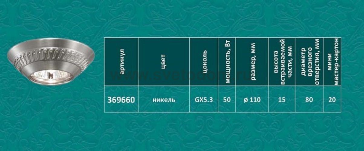 Встраиваемые светильники – популярное осветительное оборудование, которое можно использовать в качестве основного источника или в дополнение к люстре. Они позволяют создать нужную атмосферу атмосферу и привнести в интерьер уют и комфорт. Интернет-магазин «Светодом» предлагает стильный встраиваемый светильник Novotech 369660. Данная модель достаточно универсальна, поэтому подойдет практически под любой интерьер. Перед покупкой не забудьте ознакомиться с техническими параметрами, чтобы узнать тип цоколя, площадь освещения и другие важные характеристики. Приобрести встраиваемый светильник Novotech 369660 в нашем онлайн-магазине Вы можете либо с помощью «Корзины», либо по контактным номерам. Мы развозим заказы по Москве, Екатеринбургу и остальным российским городам.