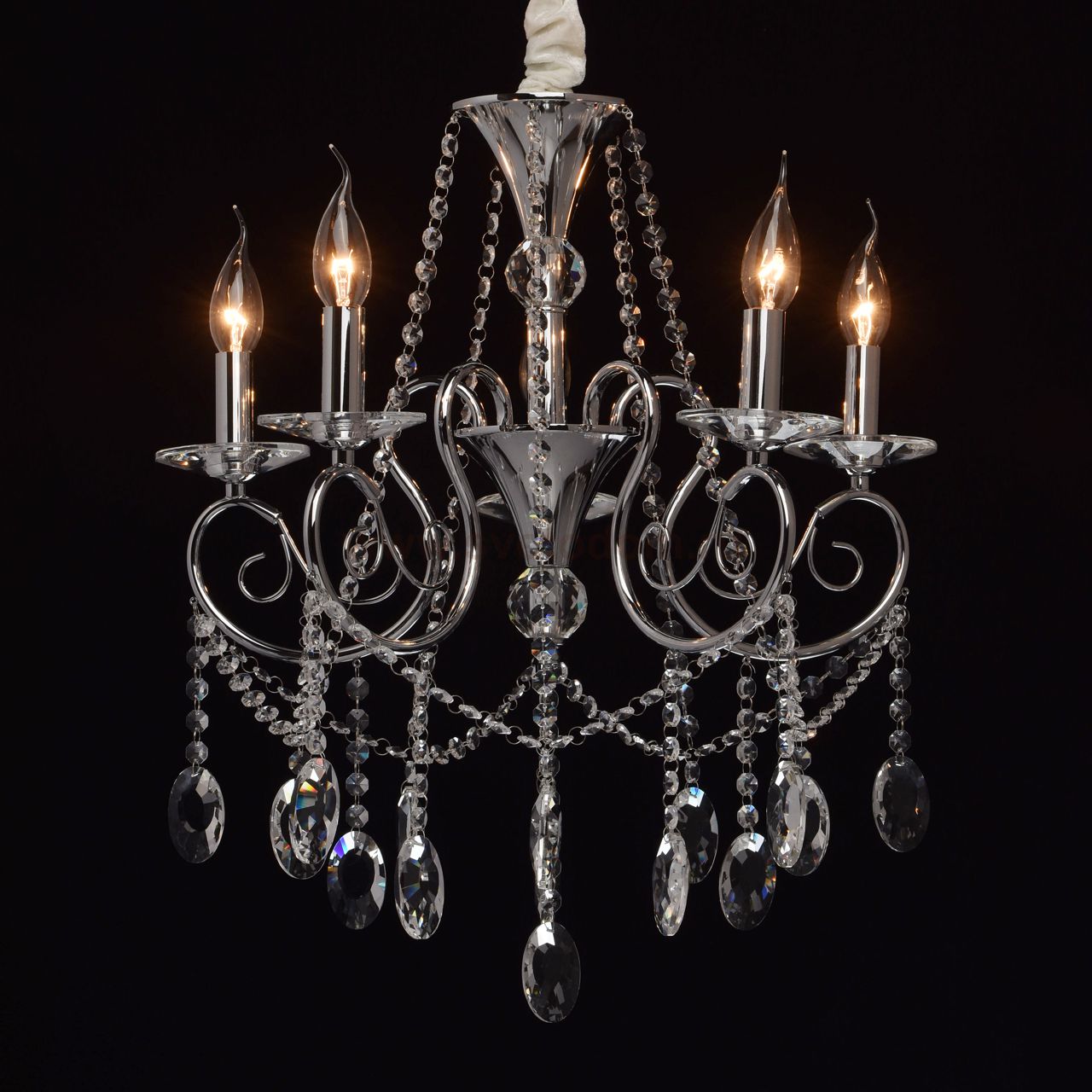 Основание: металл, гальванизировано в цвет хрома. Рожки выполнены по технологии проката на роликовом станке. Декоративные элементы на центральной оси выполнены по технологии токарной обработки. Центральная ось декорирована массивами хрусталя. Декоративные розетки выполнены из массива хрусталя. Светильник декорирован подвесками из хрусталя высокого качества формы октагон и овал. Комментарий
