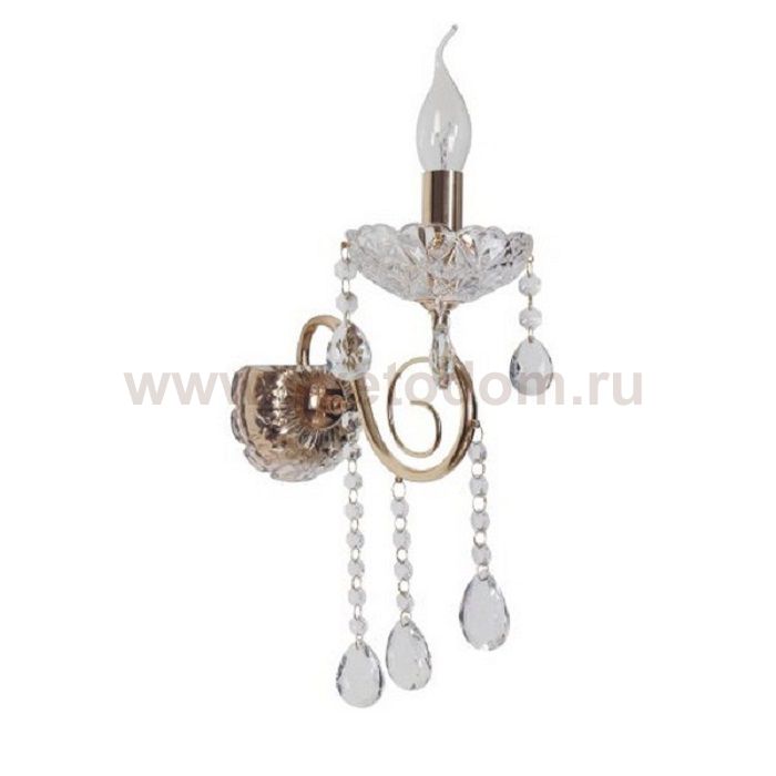 Основание бра: металл, гальванизировано в цвет французского золота. Декоративная розетка выполнена из стекла, отлитого в сложную форму. Основание также закрыто декоративной розеткой. Светильник декорирован подвесками из хрусталя высокого качества, формы октагон и миндаль. Комментарий