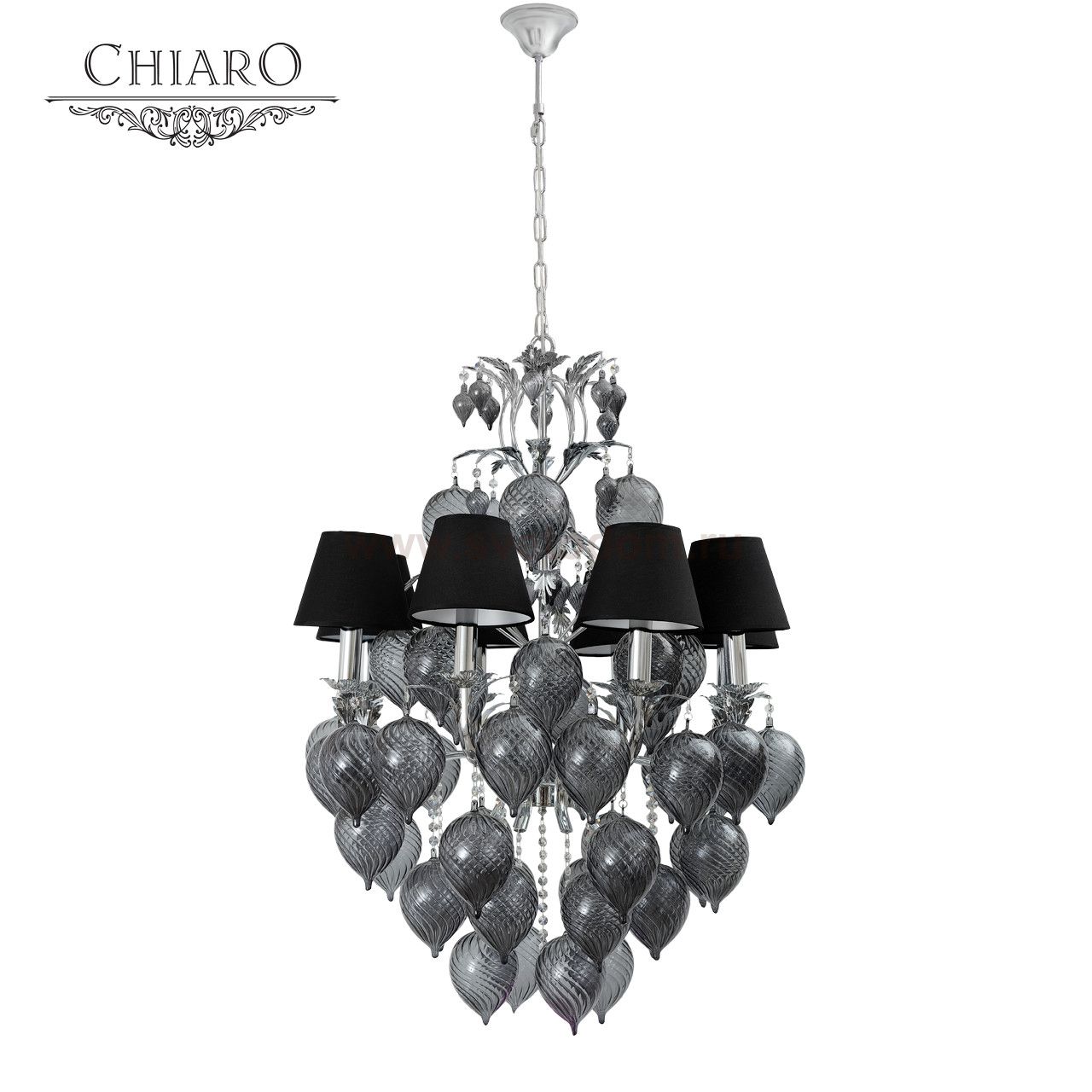 Металлическое основание цвета хрома, объёмные декоративные элементы из дутого стекла дымчатого оттенка, текстильные плафоны Место применения