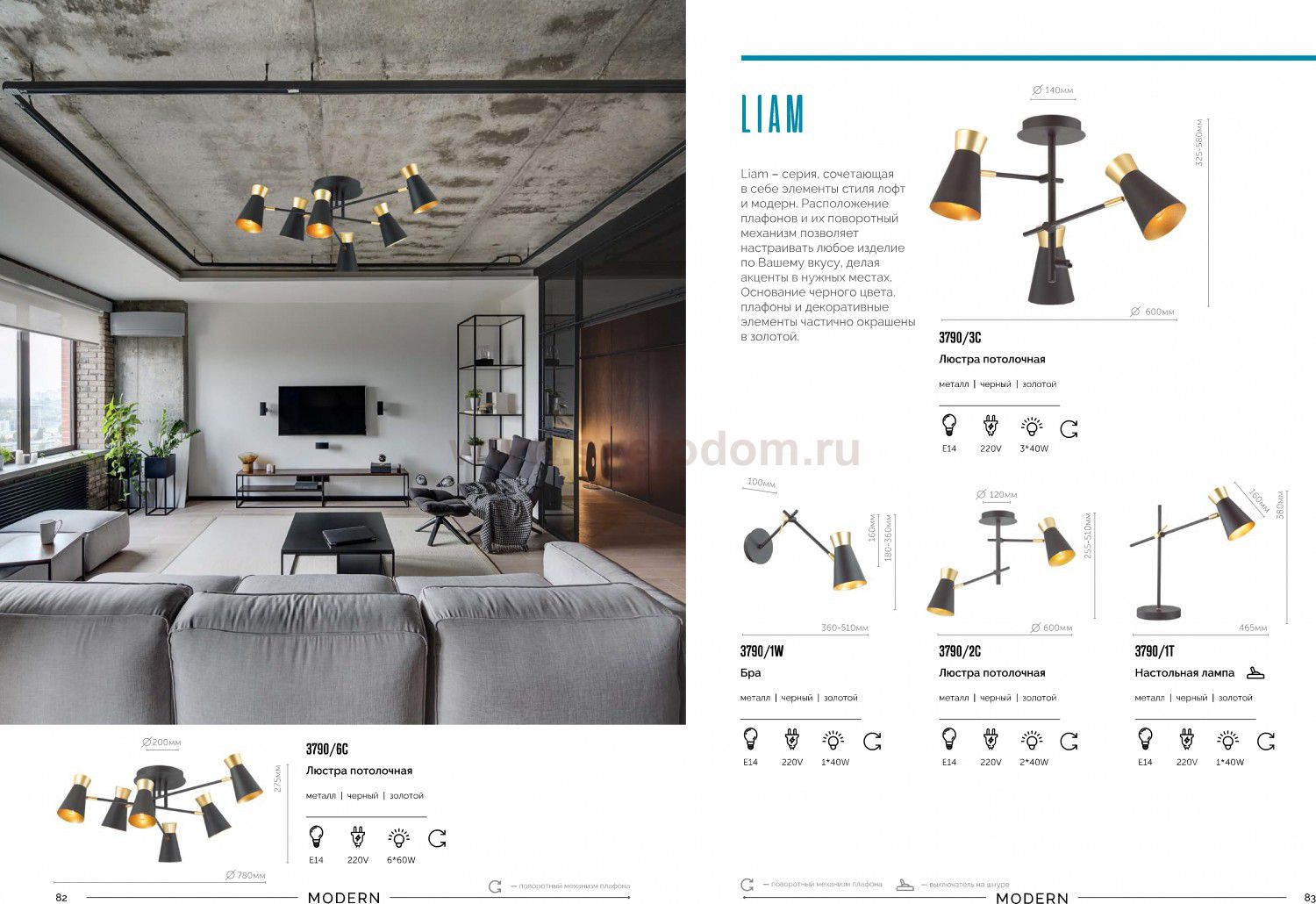 Liam - линия, сочетающая в себе элементы стиля лофт и модерн. Расположение плафонов и их поворотный механизм позволяет настраивать любое изделие по Вашему вкусу, делая акценты в нужных местах. Основание черного цвета, плафоны и декоративные элементы частично окрашены в золотой.