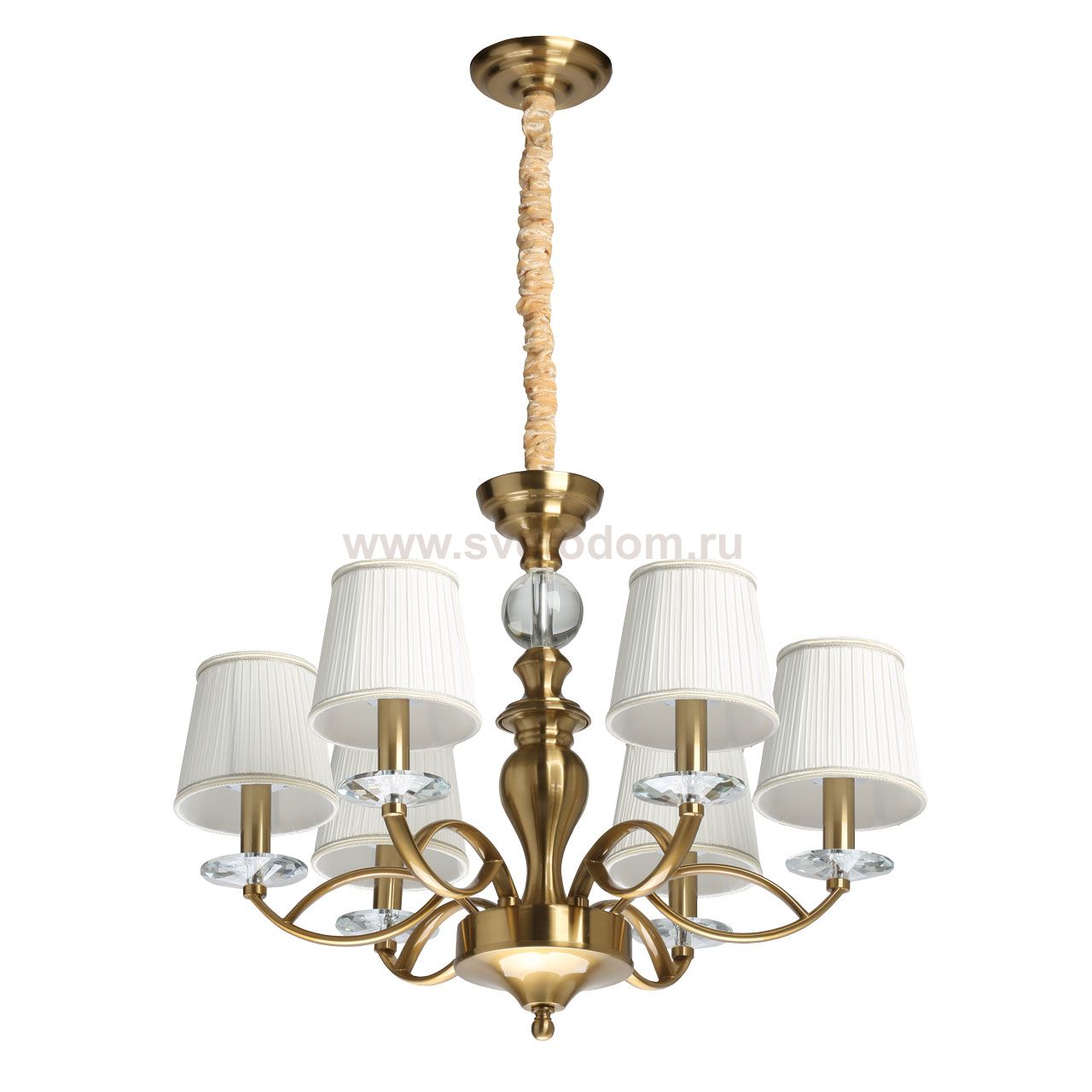 Металлическое основание потолочной люстры гальванизировано в цвет медовая бронза. Источники света закрыты белыми текстильными абажурами. Люстра декорирована массивами хрусталя. Комментарий