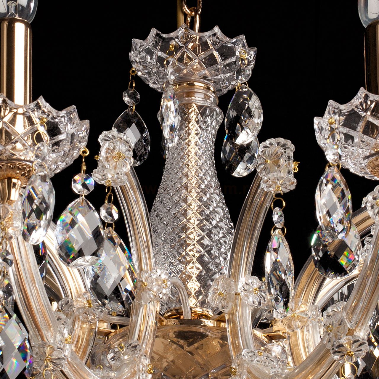 Описание модели 405010508: Для истинных эстетов, мечтающих украсить интерьер восхитительной люстрой, выполненной в лучших классических традициях, идеально подойдет светильник из коллекции «Одетта». Золотистое металлическое основание в сочетании с элементами из выдувного стекла и грациозными свечами образует сказочно красивую композицию. Декор из округлых хрустальных подвесок завершает дизайн люстры и создает в обстановке интерьере притягательную игру света.