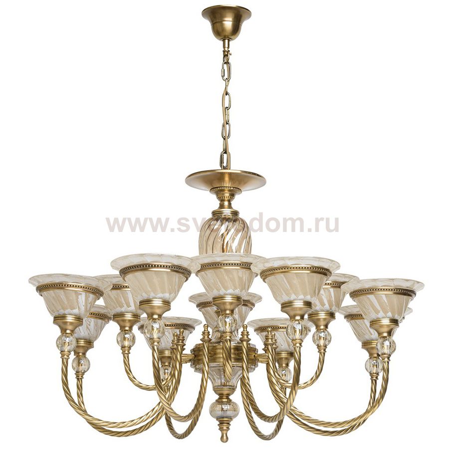 Арматура выполнена из благородого материала - латунь. Витые рожки. Центральный стержень украшен декоративным элементом из гутного стекла сложной витой формы и окрашенным методом гальванизации. Центральный стержень завершается украшениями из хрустального стекла с рисунком, нанесенным алмазным резцом. Плафоны выполнены из окрашенного стекла и украшенного с внутренней стороны хрустальной крошкой. Край плафонов обработан по технологии фацетирования, сочетания многократной шлифовки и полировки. Плафоны украшены латунными кольцами с чеканкой, с винтовым креплением. Комментарий