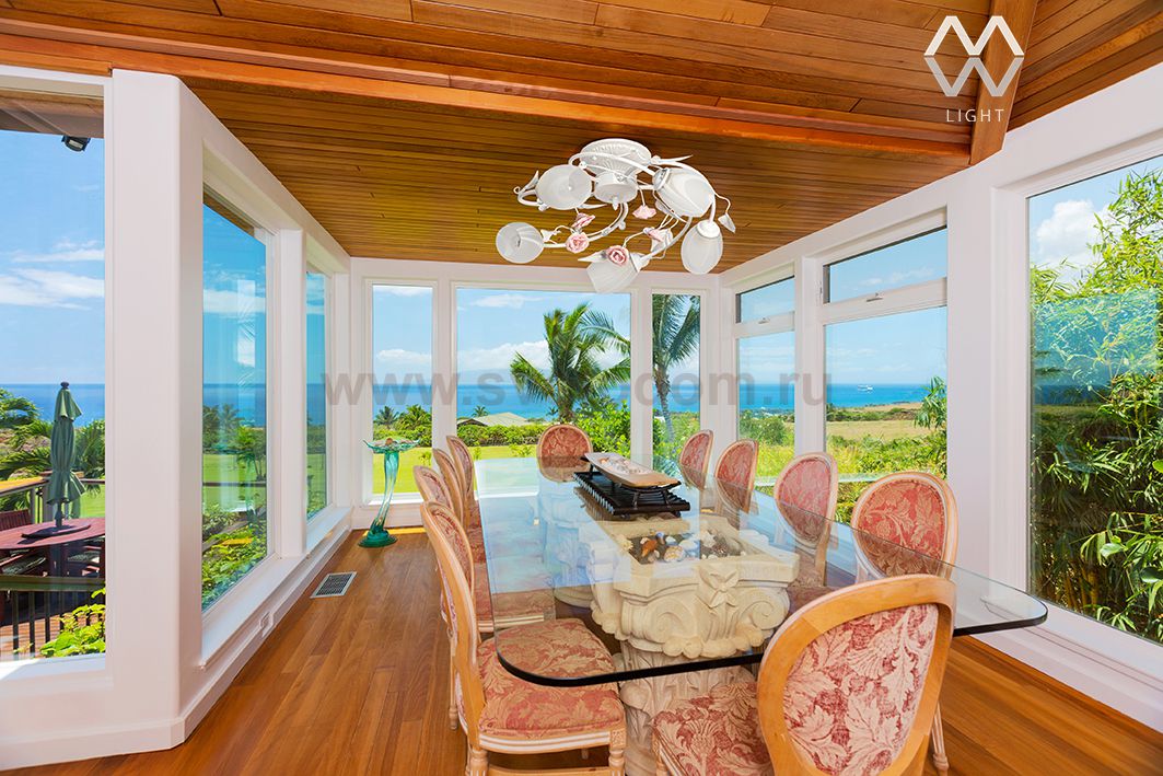 Декоративные элементы: металл, листья, выполнены по технологии прессования и окрашены вручную в белый цвет соответственно. Ветви: выполнены по технологии прокат на роликовом станке. Цветы выполнены из керамики и окрашены вручную в розовый цвет. Плафоны из стекла, матированы по трафарету. Дополнительно