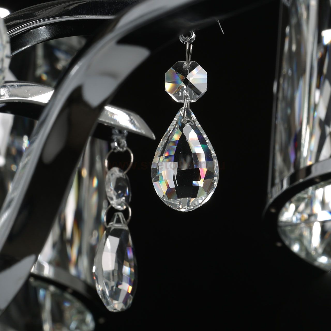 Металлическое основание светильника гальванизировано в цвет хрома. Светильник декорирован хрусталем прямоугольной формы. Декоративные розетки выполнены из массива хрусталя. Комментарий