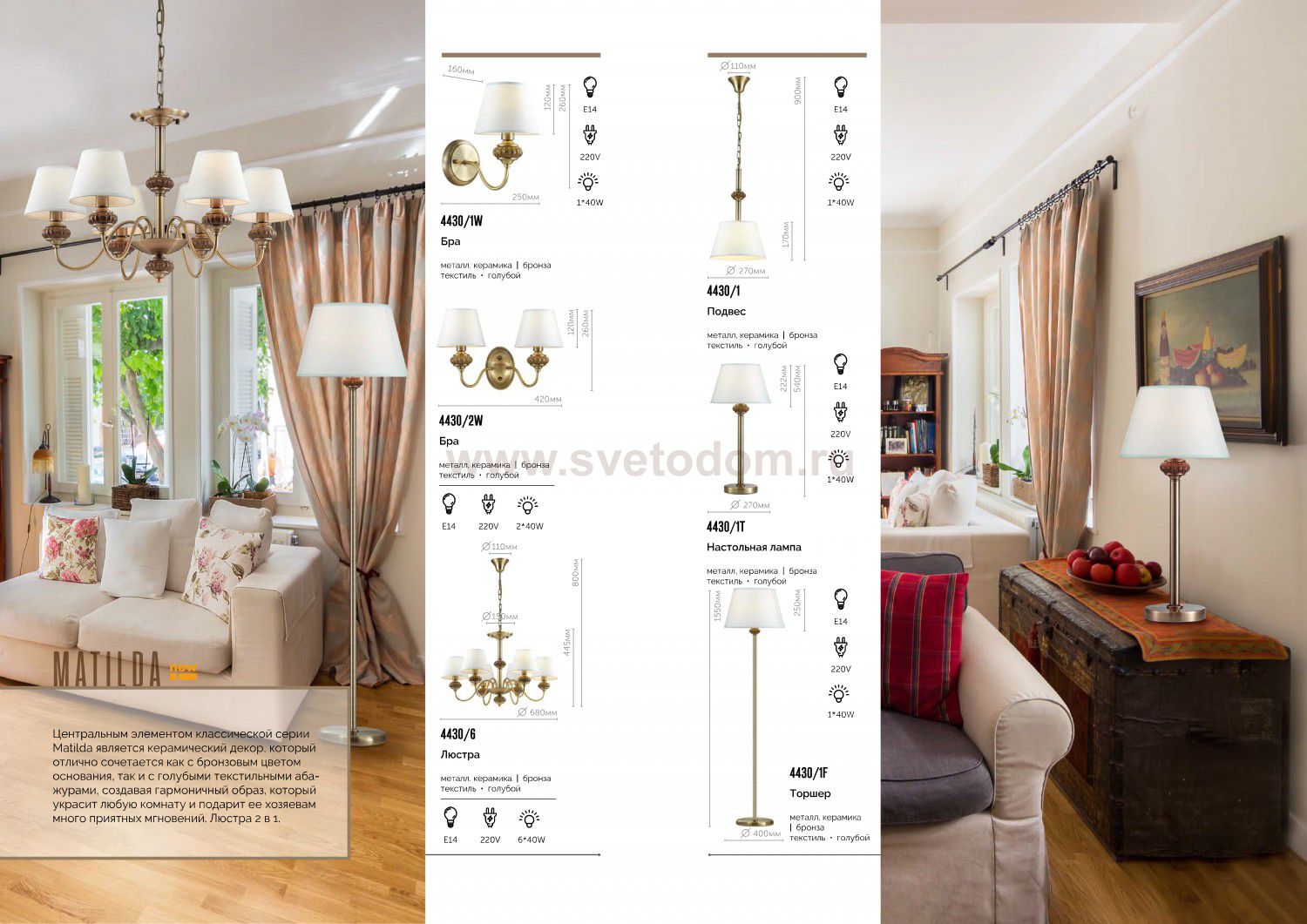 Центральным элементом классической линии Matilda является керамический декор, который отлично сочетается как с бронзовым цветом основания, так и с голубыми текстильными абажурами, создавая гармоничный образ, который украсит любую комнату и подарит ее хозяевам много приятных мгновений. Люстра 2 в 1.