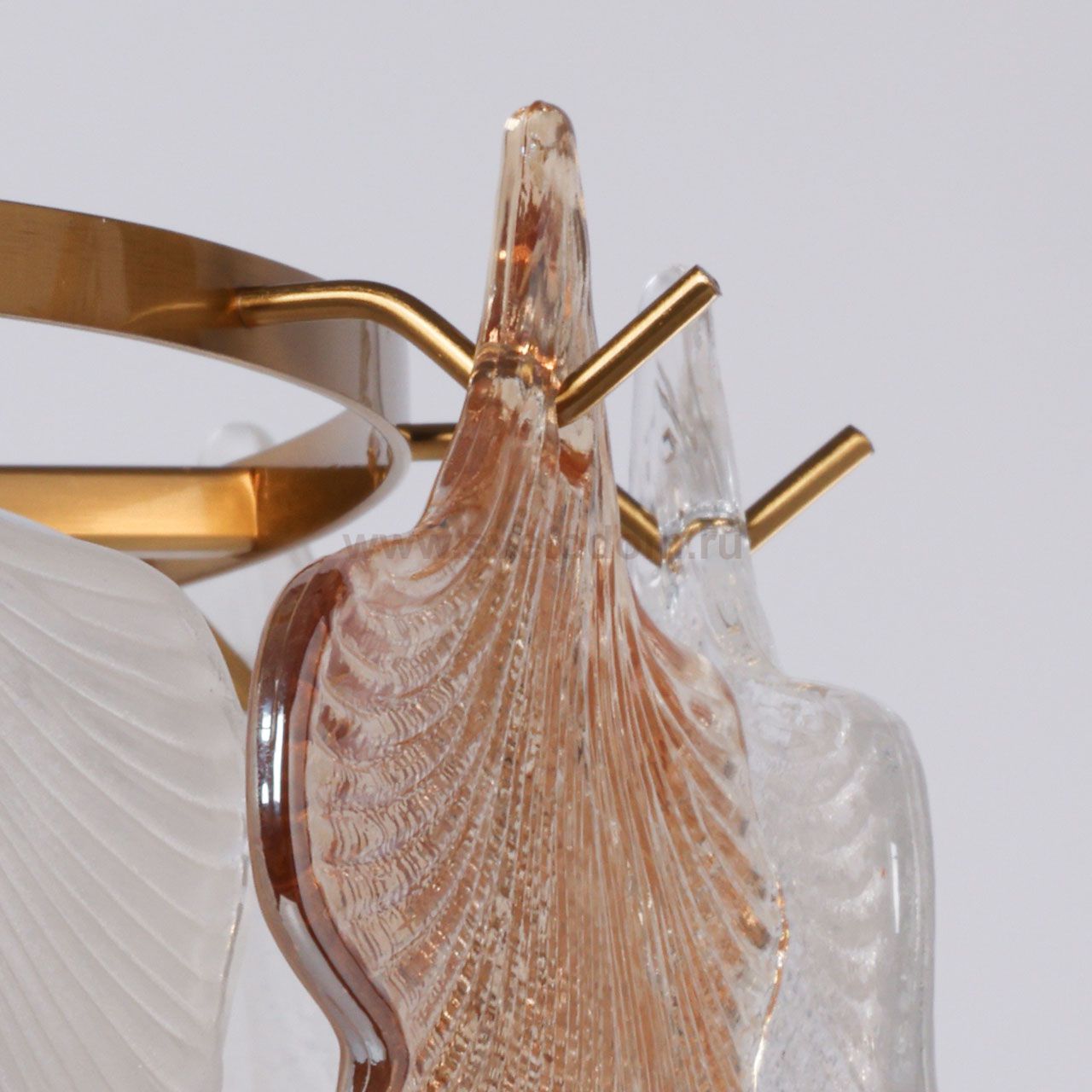 Металлическое основание подвесной люстры гальванизировано в цвет латуни. Светильник декорирован стеклянными пластинами матовыми и гальванизированными в цвет шампань и янтарь. Стеклянные пластины отлиты в форму в виде листьев. Комментарий