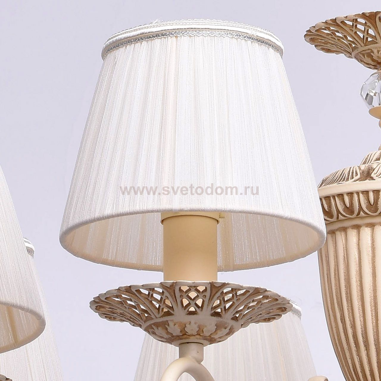 Описание модели 450014208: Грациозная люстра из коллекции «Ариадна» станет украшением интерьера оформленного в стиле современной классики. Металлическое основание цвета слоновой кости подчеркнуто золотым патинированием, придающим легкий эффект состаренности. Среди других элементов, отсылающих нас к благородной старине – резные детали, обильно украшающие основание, а так же ажурные чаши у источников света, напоминающие нежное кружево. Гармонично сочетаются с цветовой гаммой основания абажуры молочного оттенка, выполненные из полупрозрачной ткани с золоченой нитью. Рекомендуемая площадь освещения порядка 16 кв.м.