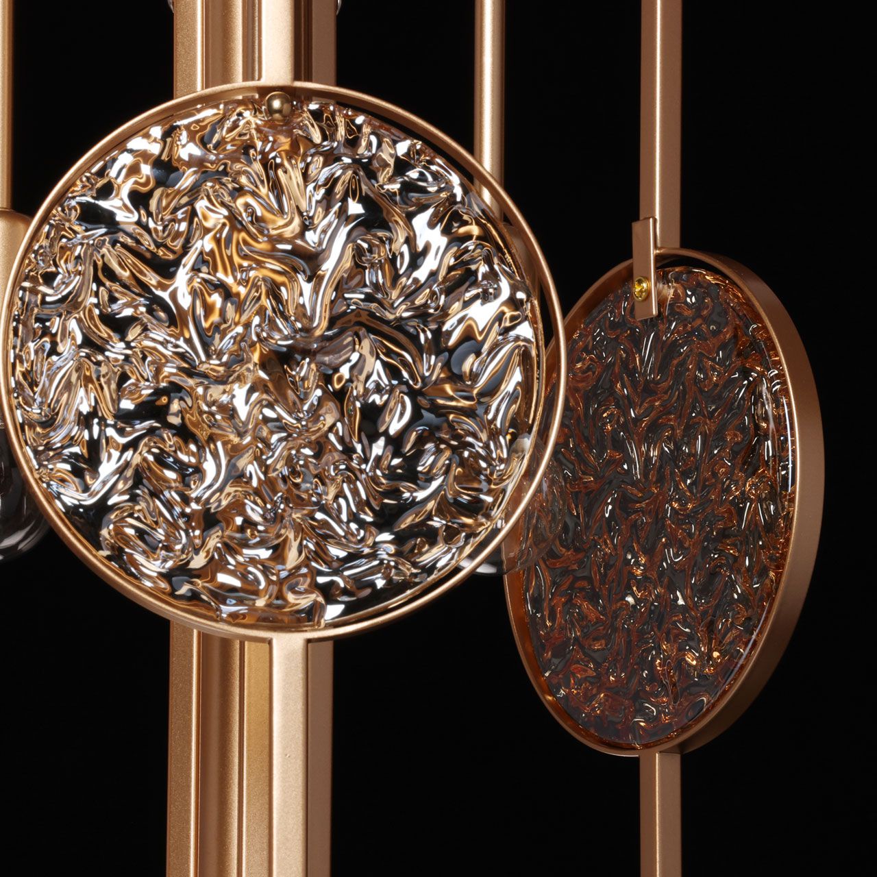 Металлическое основание подвесной люстры окрашено в цвет перламутрового золота. Декор выполнен из фактурного стекла, гальванизированного в цвет янтаря. Комментарий