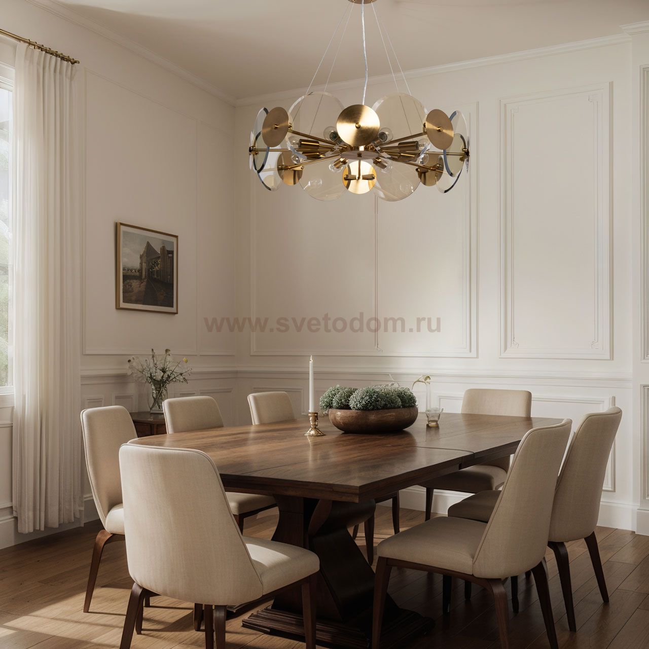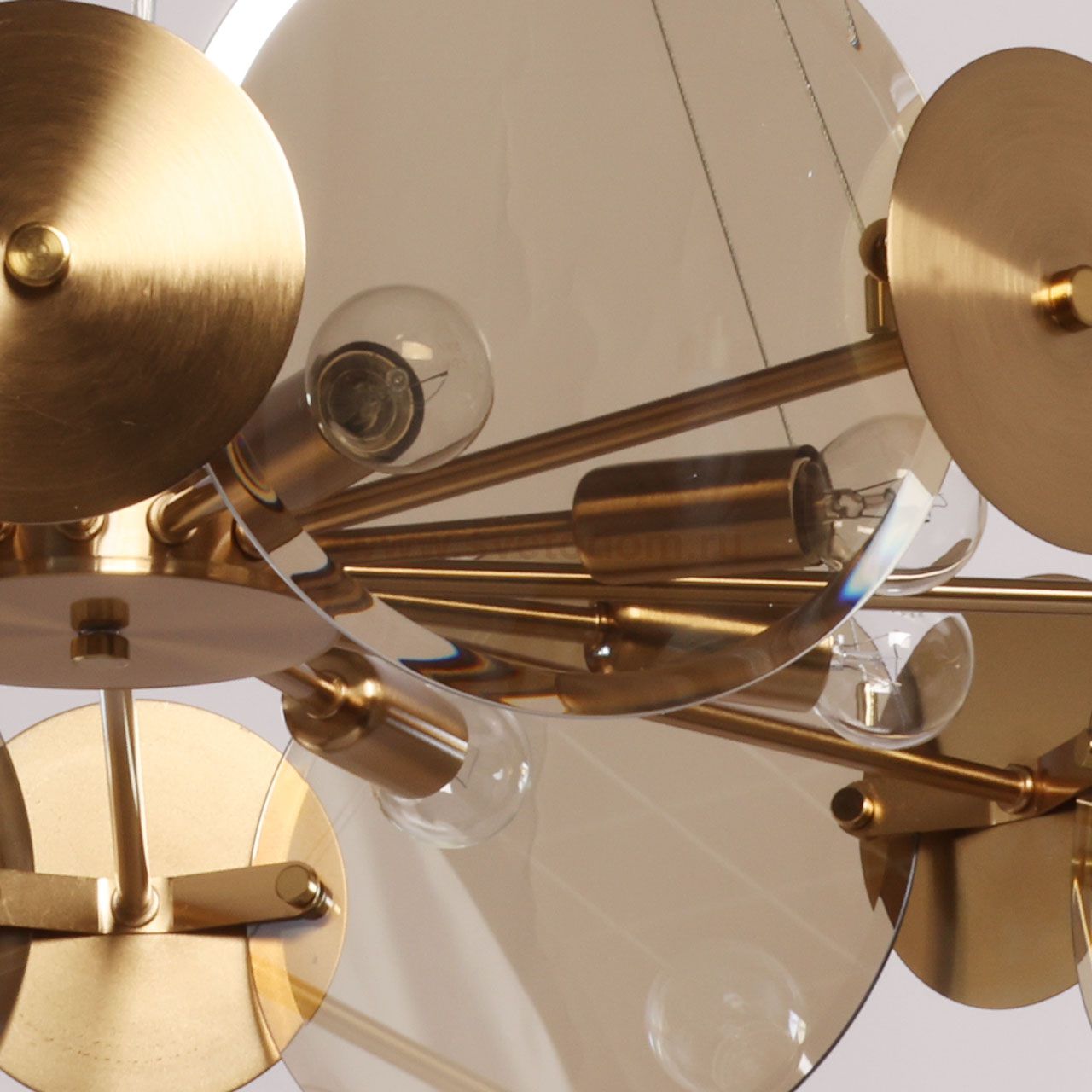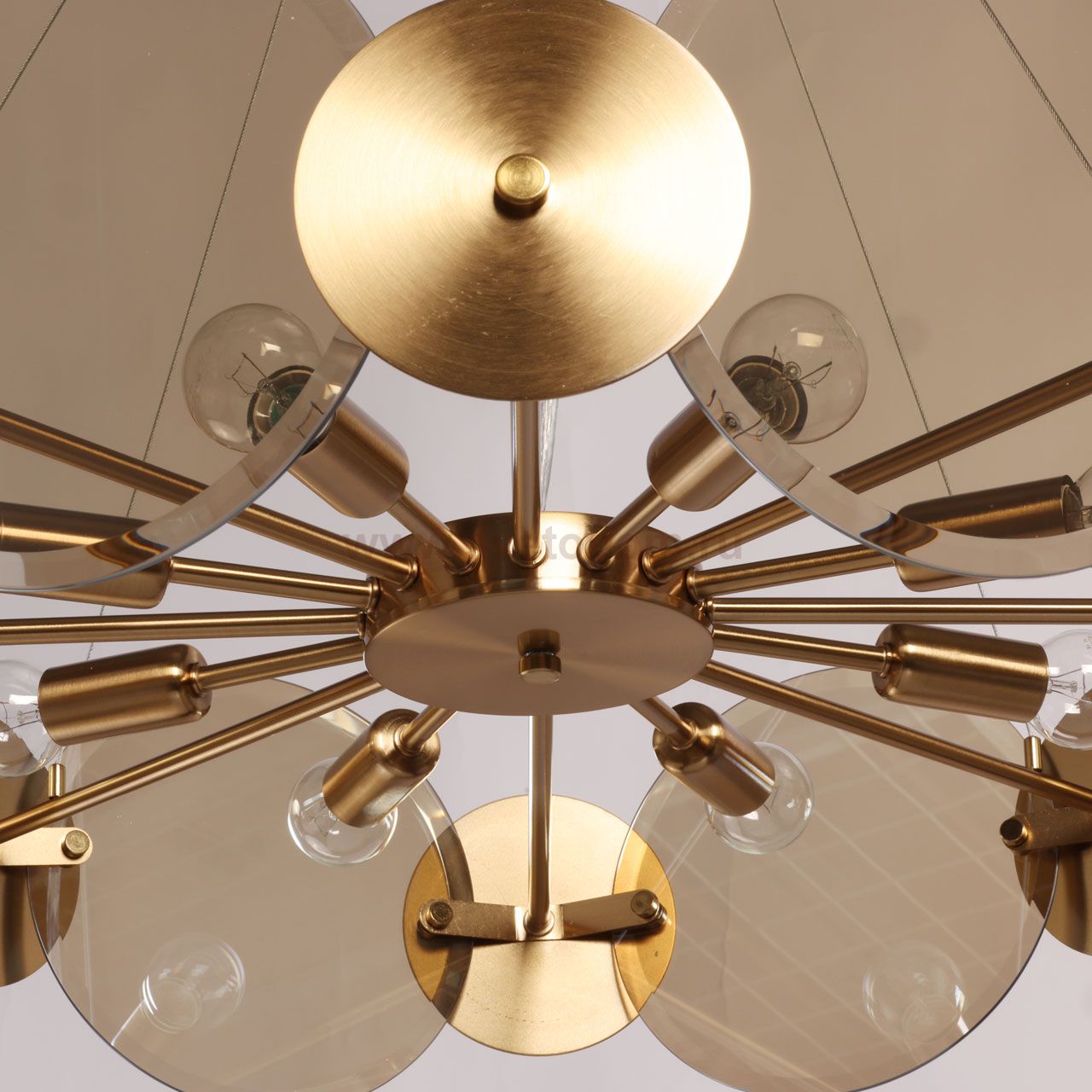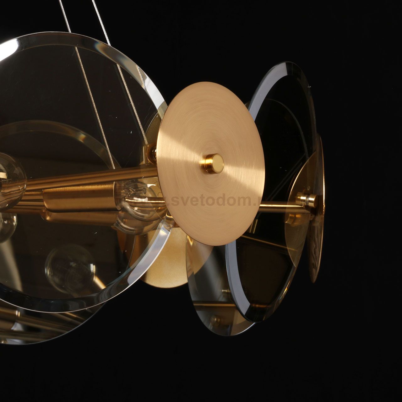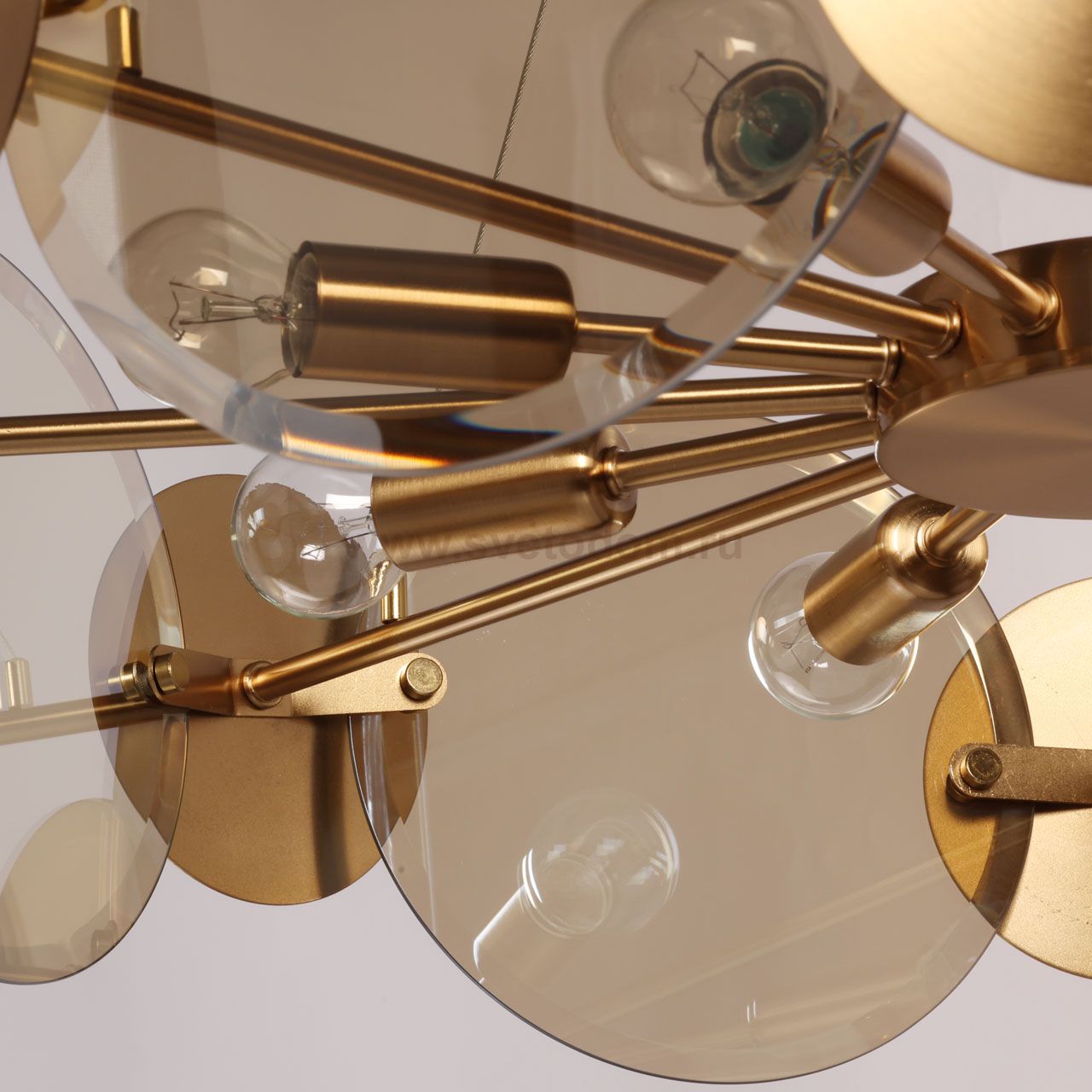 Металлическое основание подвесной люстры гальванизировано в цвет латуни. Светильник декорирован стеклянными элементами в форме круга, гальванизированными в цвет шампань и металлическими кругами, гальванизированными в цвет основания. Комментарий