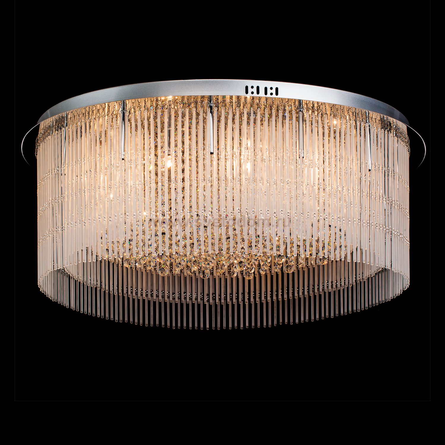 Металлическое основание цвета хрома, декоративный абажур из стеклянных матированных подвесок, прозрачный хрусталь. Материал плафона