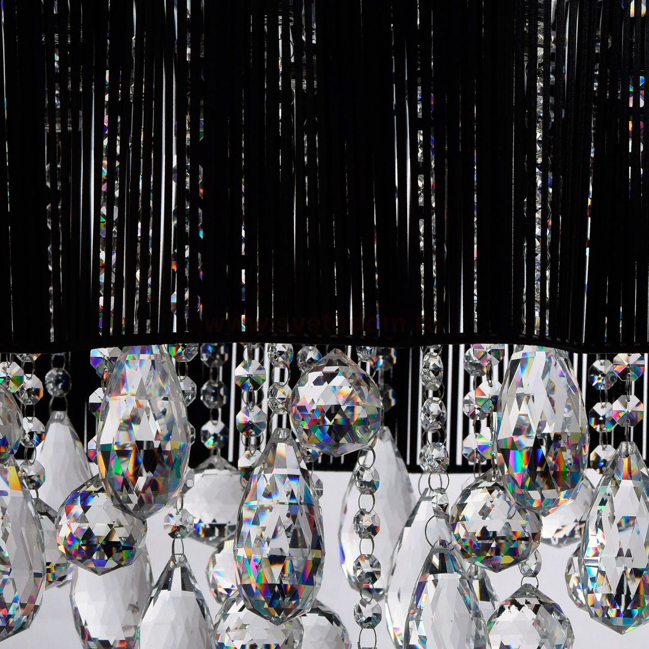 Корпус светильника выполнен из сплава металла и окрашен в серебряный цвет. Корпус закрыт листом полированной нержавеющей стали. Каркас абажура сложной формы обтянут текстильной нитью черного цвета. Светильник декорирован крупными подвесками из хрусталя сложной огранки. Комментарий