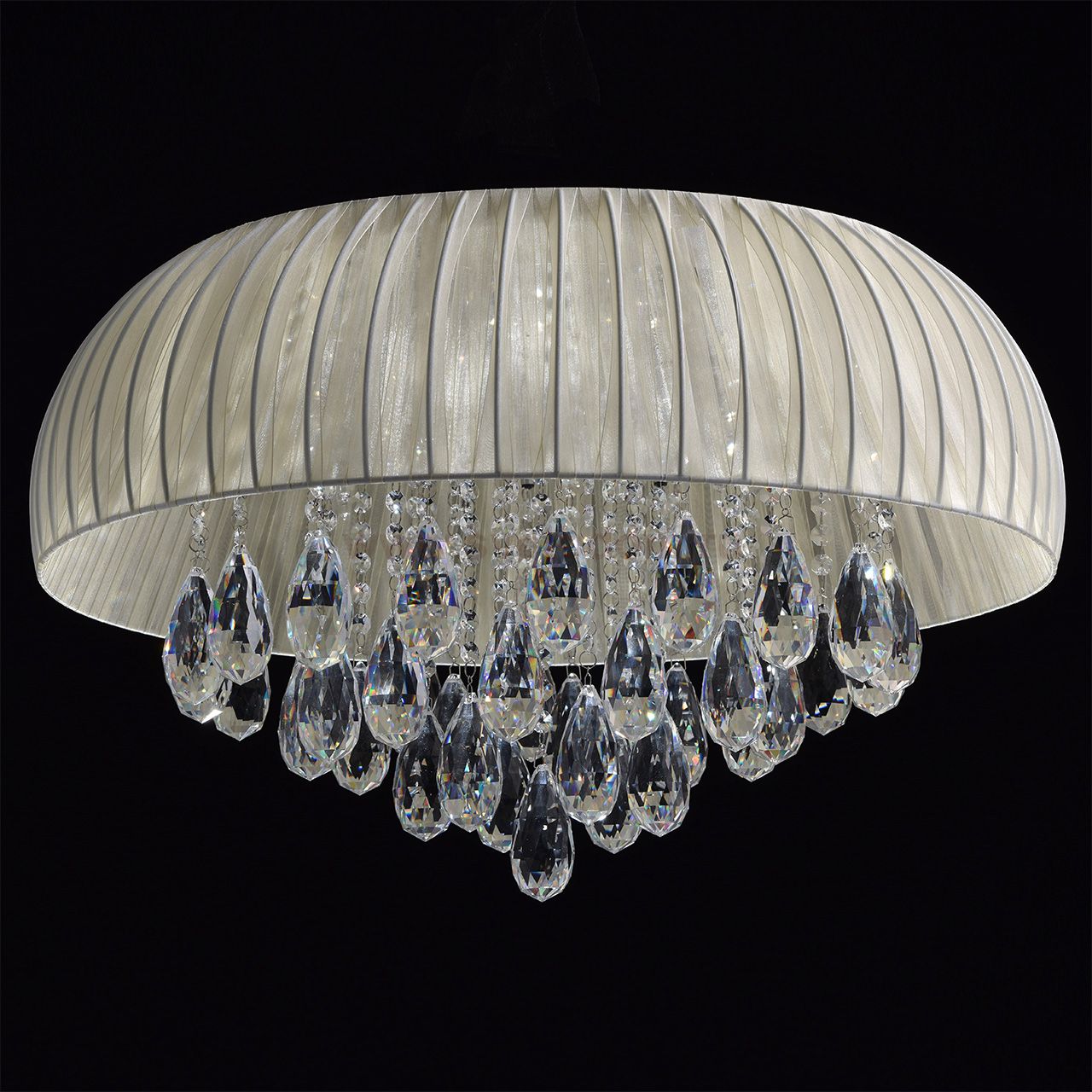 Основание выполнено из металла и окрашено в цвет серебра. Корпус закрыт полированной нержавеющей сталью. Каркас абажура обтянут тесьмой из органзы сливочного цвета. Светильник декорирован крупными подвесками из хрусталя сложной огранки. Светодиодные источники света типа SMD Chip и LED G4. Комментарий