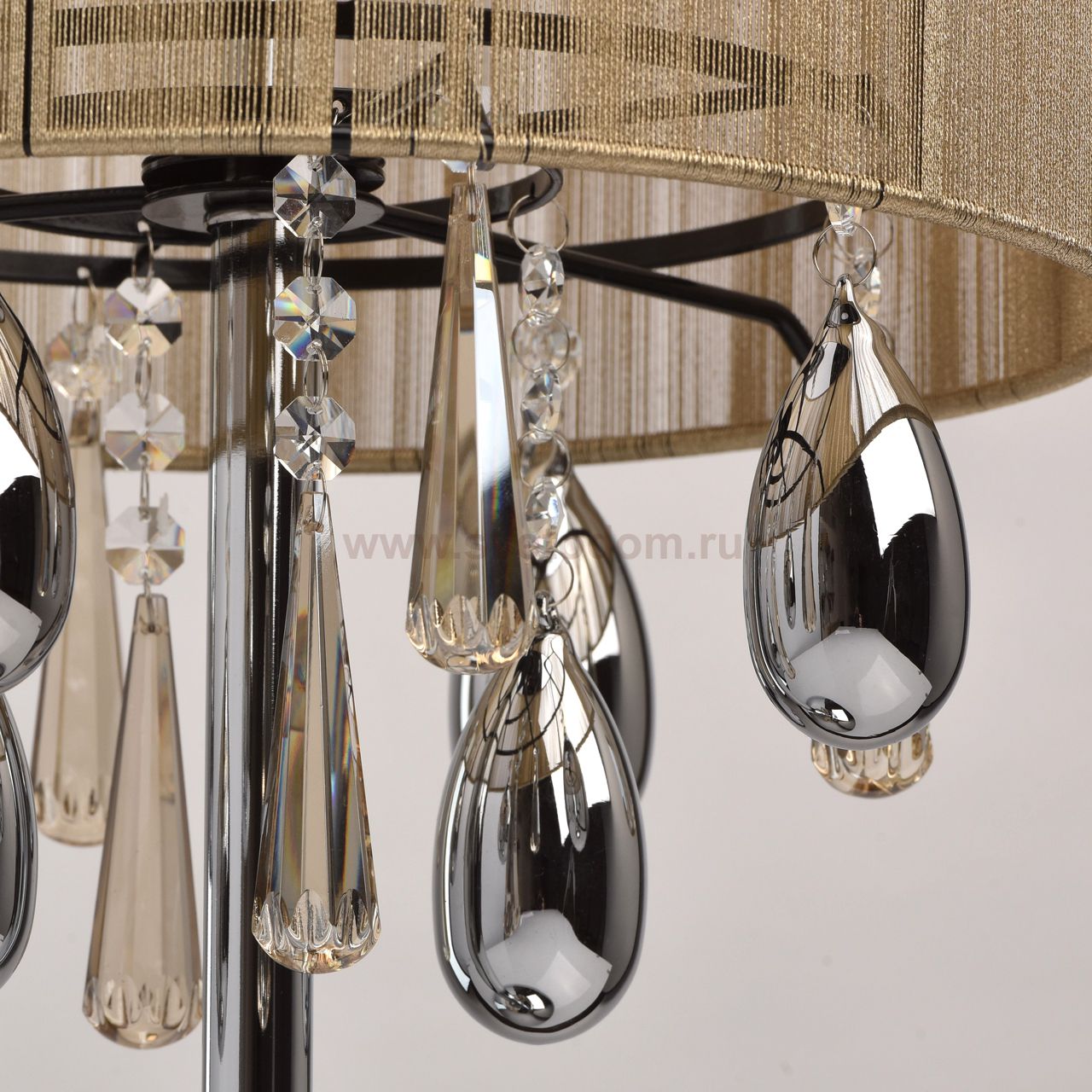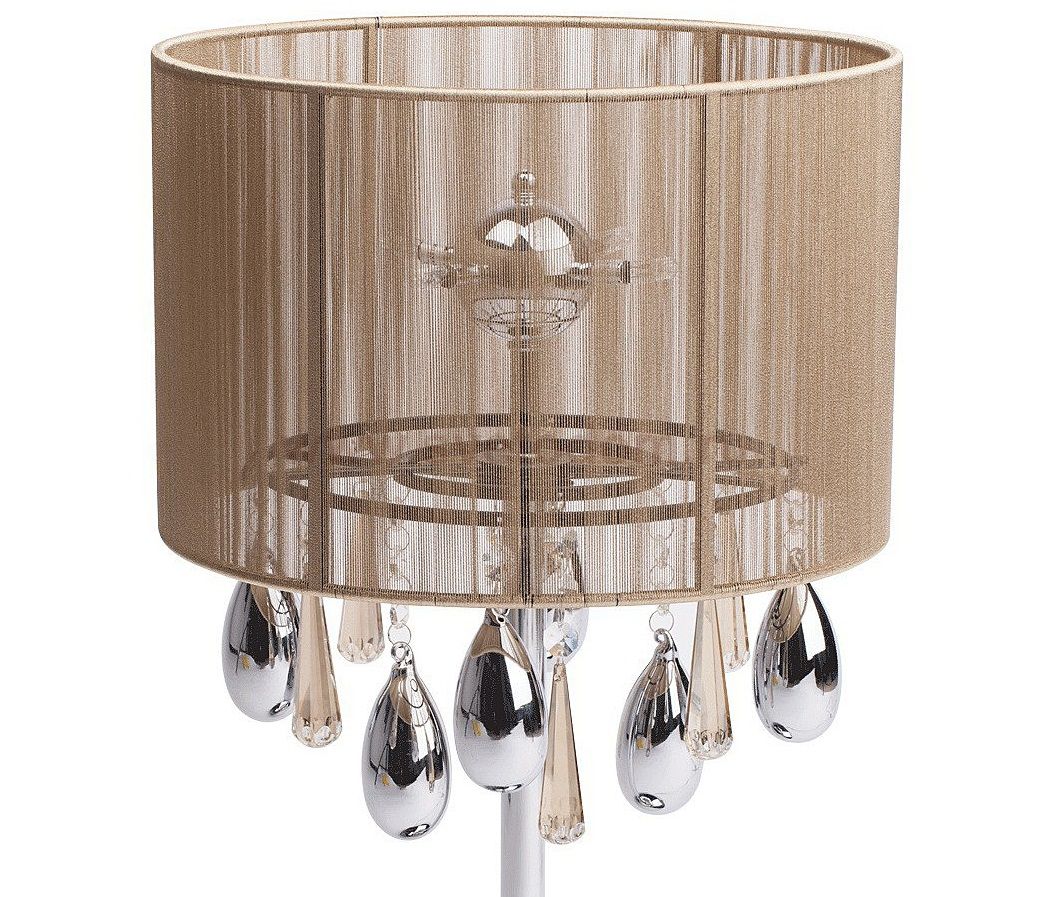Металлическое основание цвета хрома, абажур, обтянутый тонкими нитями золотого цвета. Декоративные элементы из гальванизированного хрусталя и стекла Материал плафона