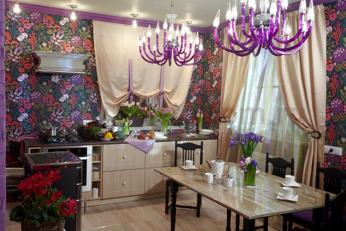 Металлическое основание цвета хрома, выдувное стекло прозрачного и фиолетового цвета, хрусталь Место применения