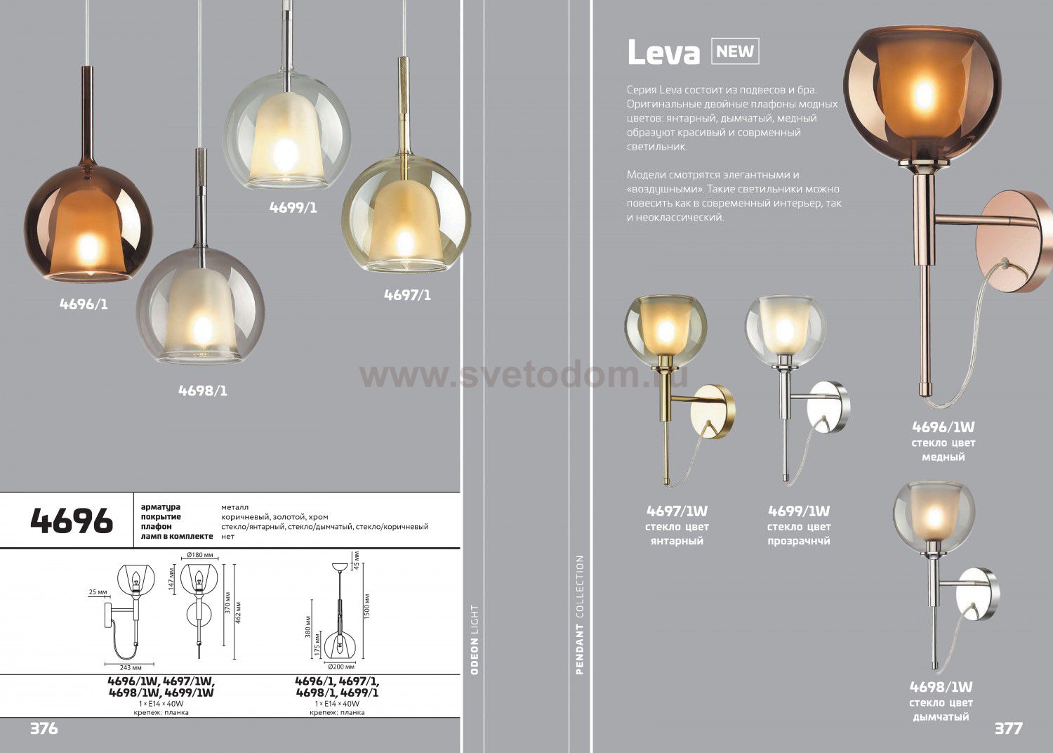 Линия Leva состоит из подвесов и бра. Оригинальные двойные плафоны модных цветов: янтарный, дымчатый, медный образуют красивый и современный светильник. Модели смотрятся элегантными и «воздушными». Такие светильники можно повесить как в современный интерьер, так и неоклассический.