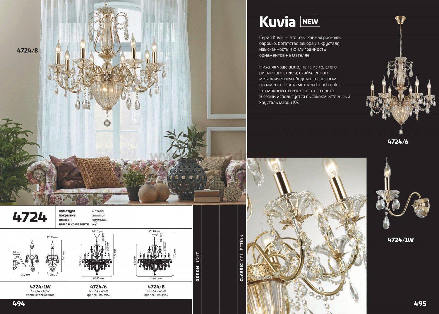 Линия Kuvia - это изысканная роскошь барокко, богатство декора из хрусталя, изысканность и филигранность орнаментов на металле. Нижняя чаша выполнена из толстого рифленого стекла, окаймленного металлическим ободом с тесненным орнаментом. Цвет металла- french gold — это модный оттенок золотого цвета. В линии используется высококачественный хрусталь марки К9.