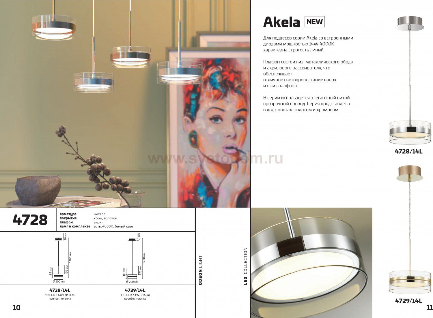 Для подвесов линии Akela со встроенными диодами мощностью 14W 4000K характерна строгость линий. Плафон состоит из металлического обода и акрилового рассеивателя, что обеспечивает отличное светопропускание вверх и вниз плафона. В линии используется элегантный витой прозрачный провод. линия представлена в двух цветах: золотом и хромовом.