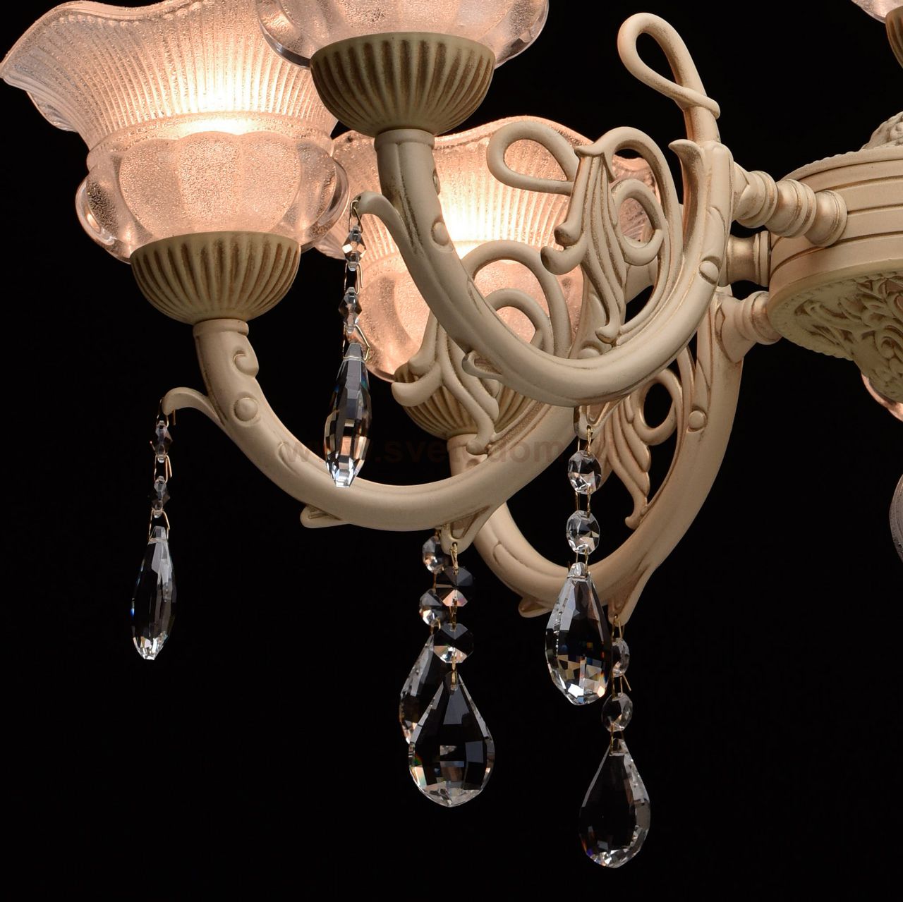 Необычные формы, мягкие изгибы, царская грациозность – люстра из коллекции «Селена» сможет идеально украсить обстановку в стиле современной классики. Основание цвета слоновой кости с эффектом золотой патины украшено фигурным орнаментом. Основание плавно переходит в изящно изогнутые рожки и завершается плафонами фантазийной формы из массивного стекла, покрытого стеклянной пудрой. Хрустальные подвесы создают дополнительную игру света, а декоративный элемент из стекла шарообразной формы в нижней части основания завершает композицию. Люстра подойдет для стандартных потолков. Площадь освещения порядка 24 кв.м