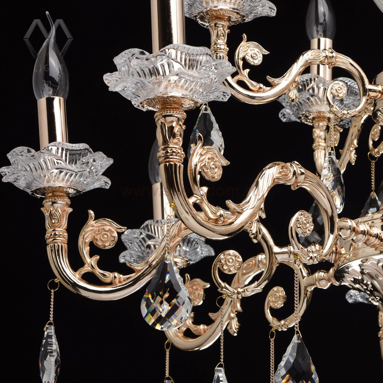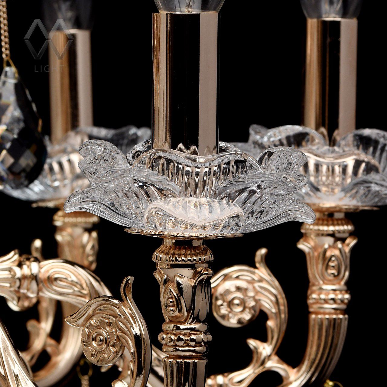 Арматура светильника выполнена из комбинации сплава железа и сплава алюминия и гальванизирована в цвет французского золота. Рожки выполнены из сплава алюминия по технологии художественного литья. Центральная ось декорирована выдувным стеклом, обработанным по технологии пескоструйного матирования. Декоративные розетки выполнены из стекла, отлитого в сложную форму. Светильник декорирован подвесками из хрусталя сложной огранки. Комментарий