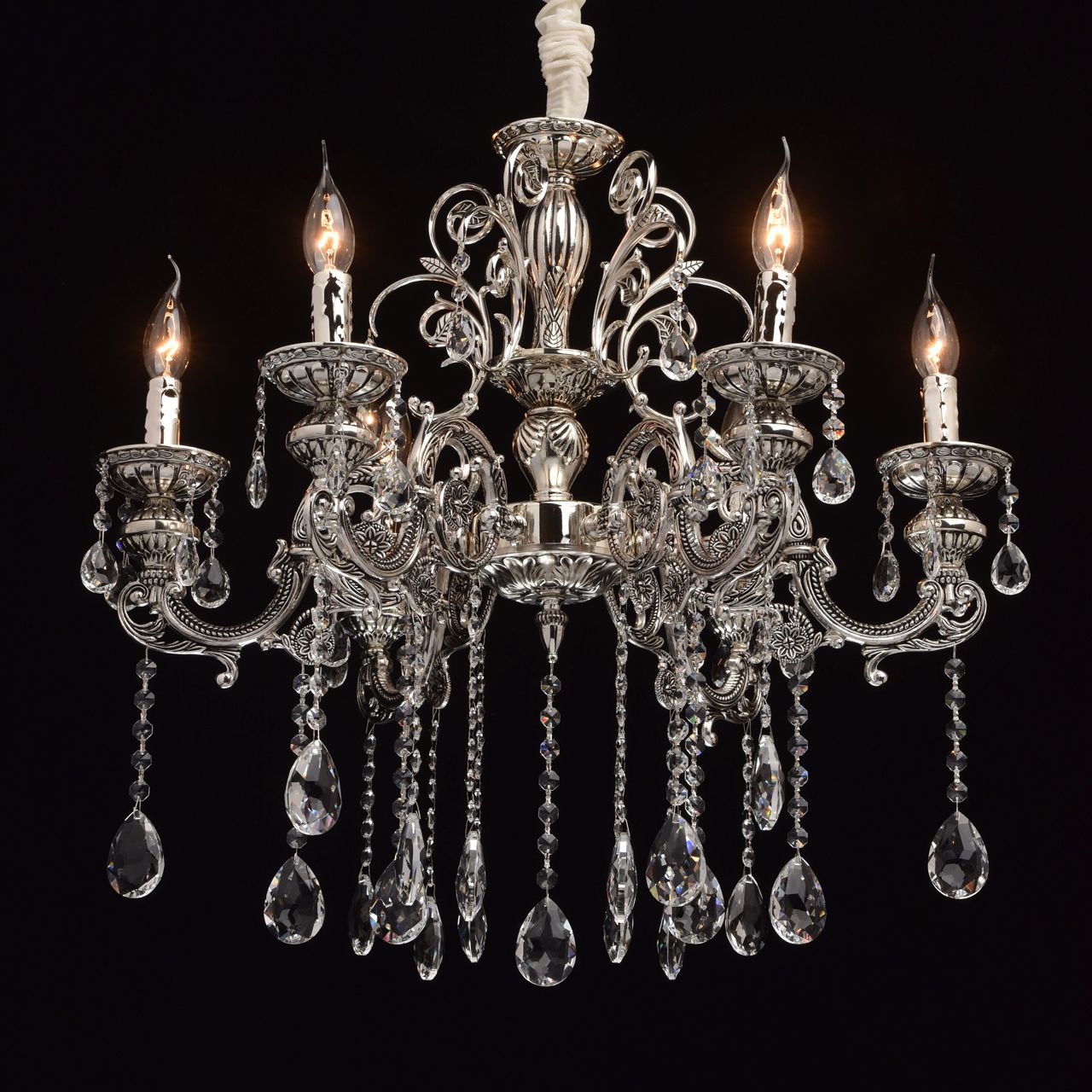 Помпезный стиль люстры из коллекции «Селена» не оставит равнодушным ценителей классических традиций в интерьере. Хромированное металлическое основание, дополненное эффектом патины цвета черненого серебра восхищает продуманным резным декором. Изящные узоры выгодно подчеркивают витиевато изогнутые рожки и объемные широкие розетки из металла. Декоративные элементы в растительной стилистике делают люстру по-настоящему очаровательной, но главная изюминка светильника – элегантные хрустальные подвесы. Их ослепительный блеск наполнит обстановку волшебной игрой света.