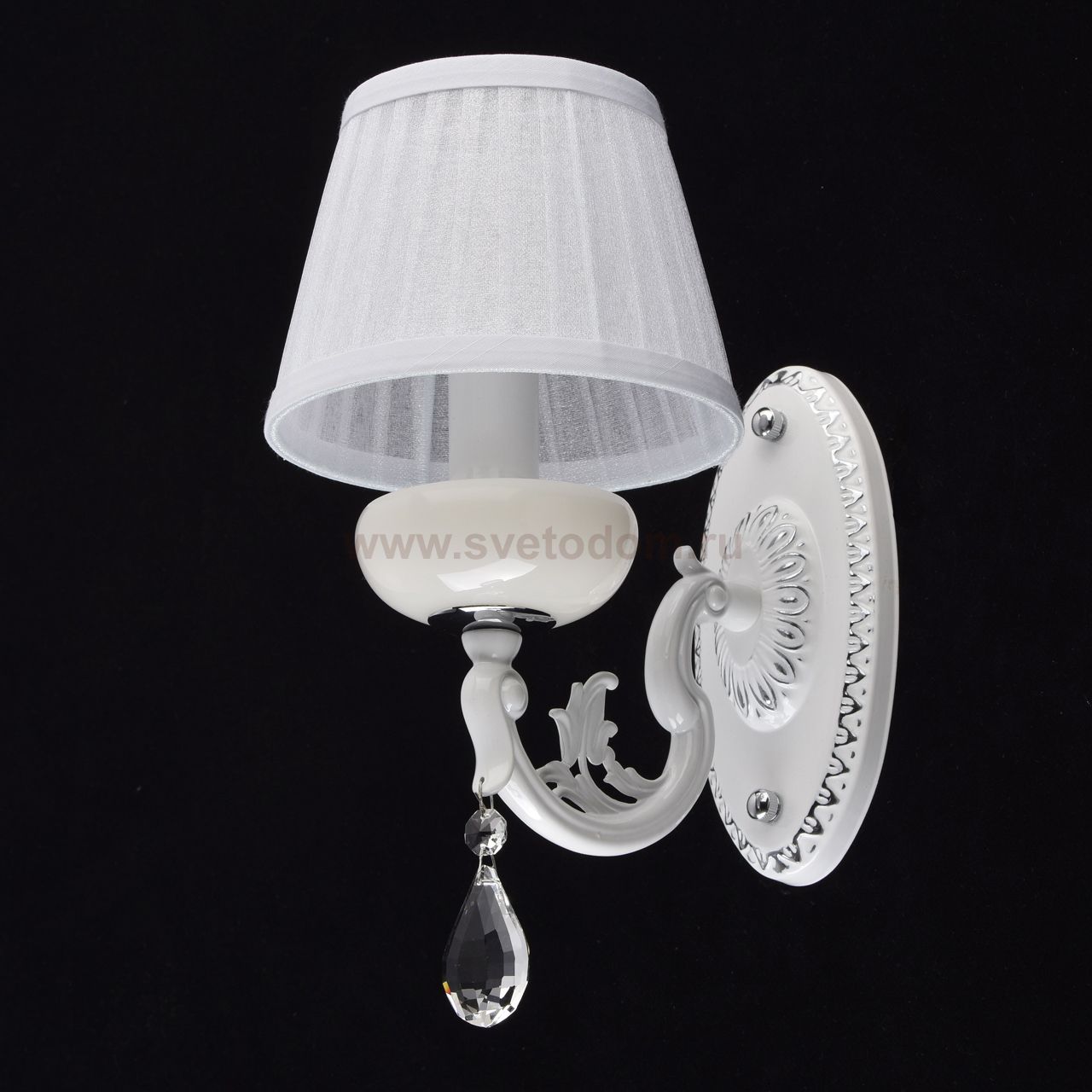 Крашеное металлическое основание белого цвета, абажур из органзы, декоративные элементы из искусственного каучука и хрусталя Материал плафона