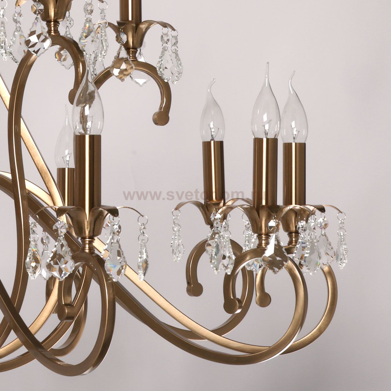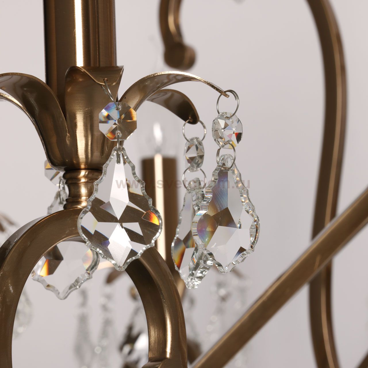 Металлическое основание подвесной люстры гальванизировано в цвет античной бронзы. Светильник декорирован прозрачным хрусталем формы дубовый лист. Комментарий