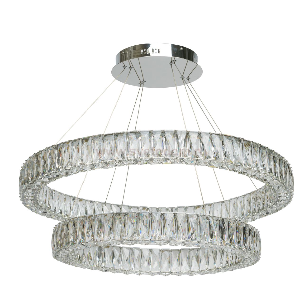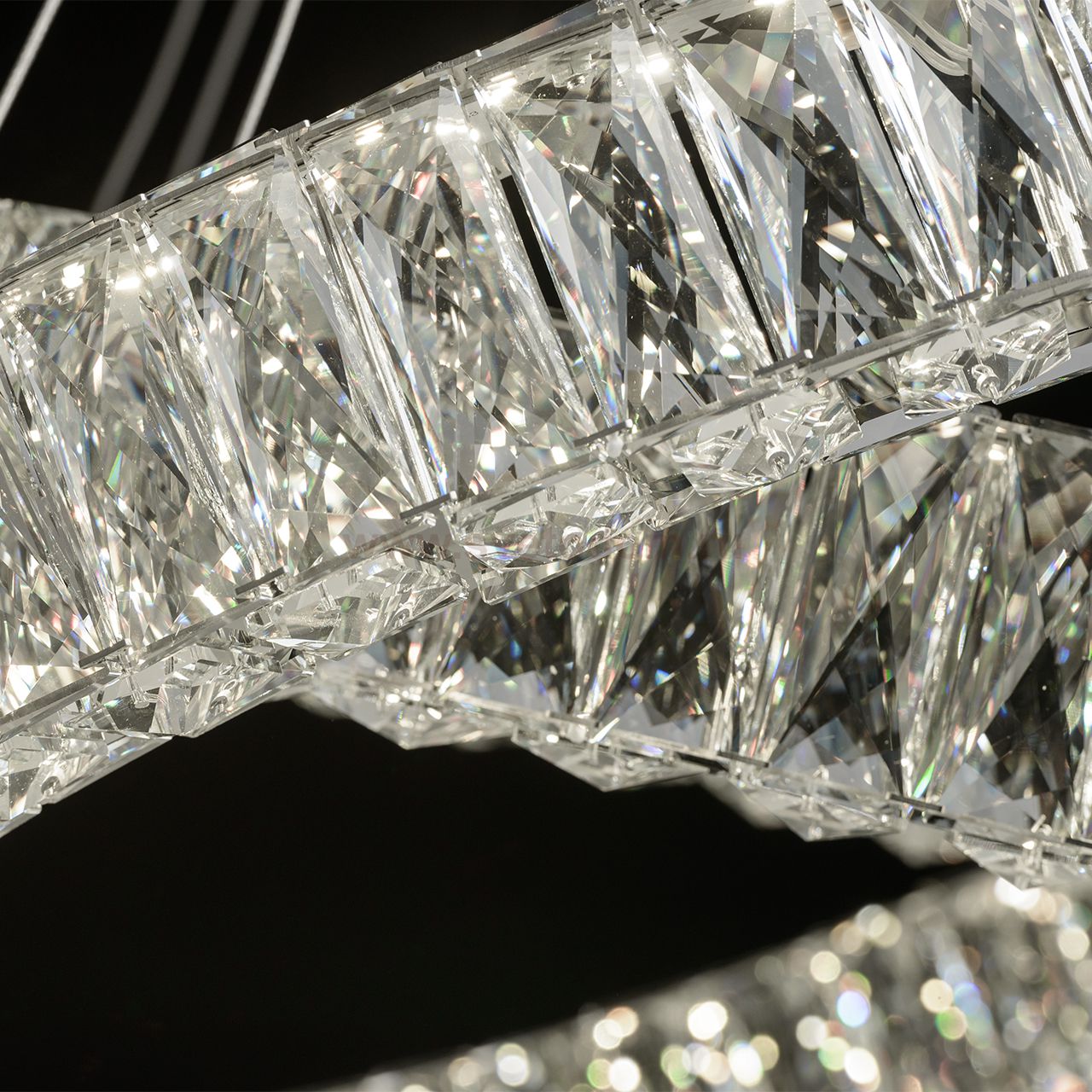 Основание выполнено из сплава металла, гальванизировано в цвет хрома. Каркас светильника выполнен из нержавеющей стали. С трех сторон светильник декорирован крупным хрусталем (высота 76 мм) сложной огранки с множеством центров схождения граней. Светодиоды на микросхемах. Световая температура 4000 - 4200 К. Лампы в комплекте. Высоту шнура можно менять. Комментарий